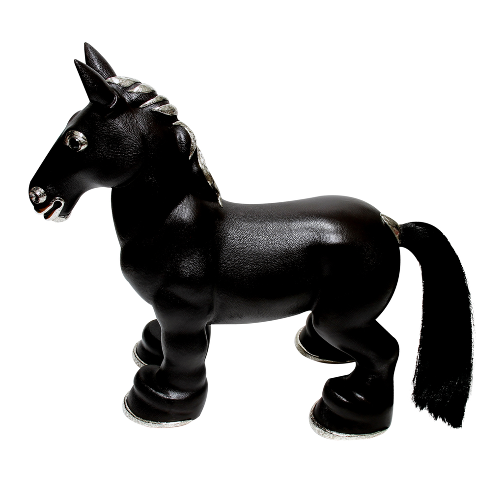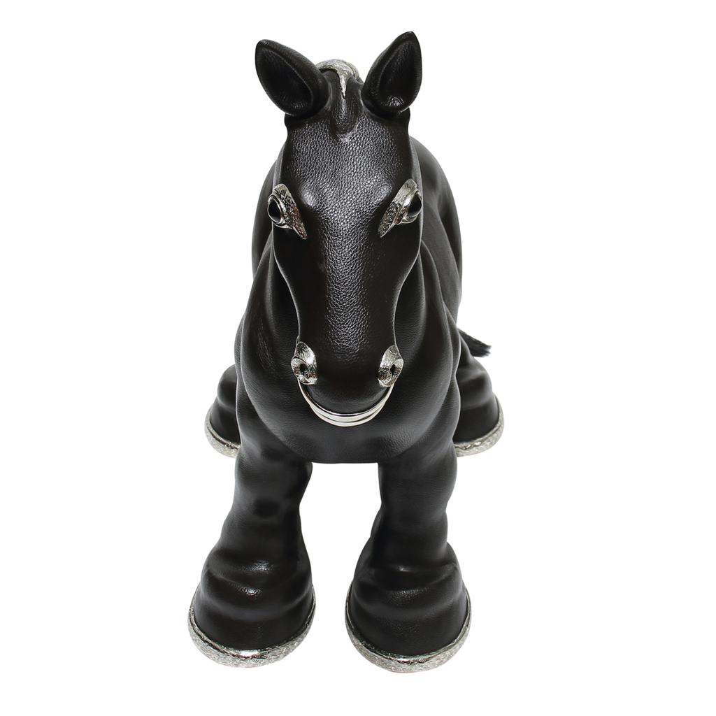 Hand-crafted Horse stool covered with sustain-ably farmed brown leather and key features decorated with metal.