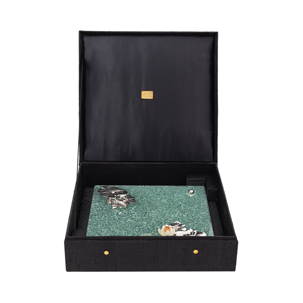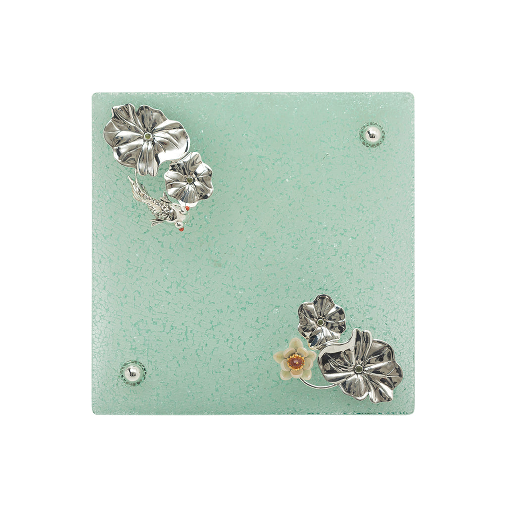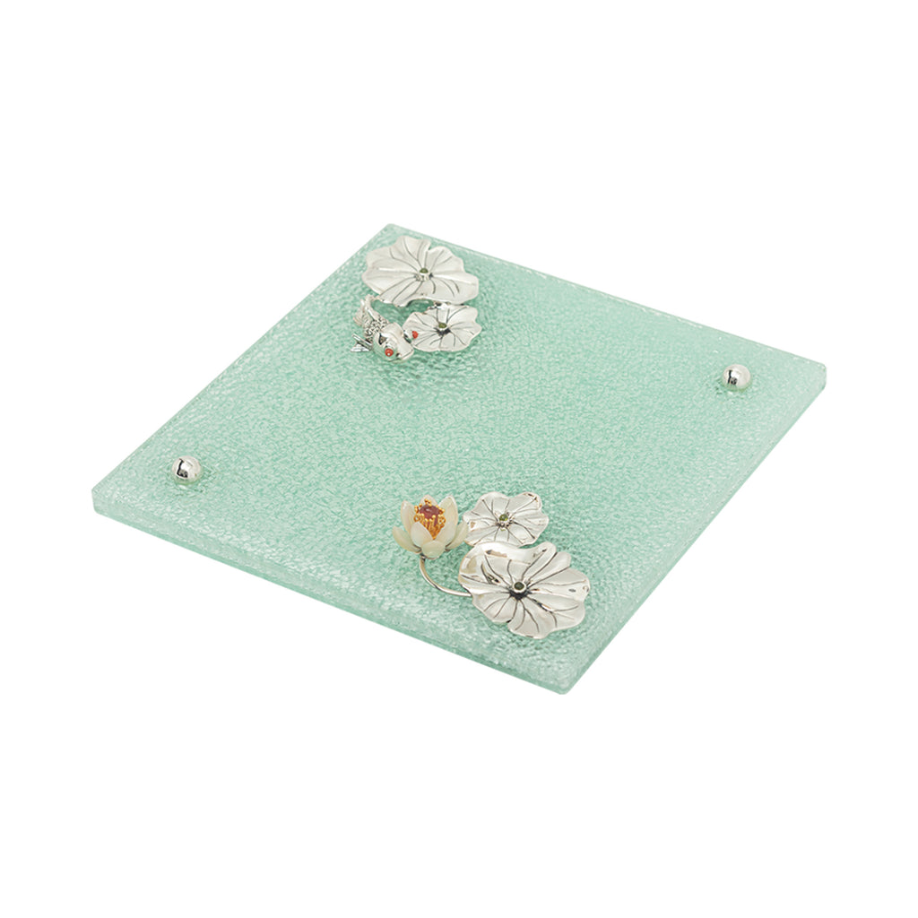 Hand-made and hand-carved green glass plate with Goldfish & Lotus Leaves. The eyes of the Gold fish are set with Red coral Beads and the lotus leaves are set with Peridots in the center.