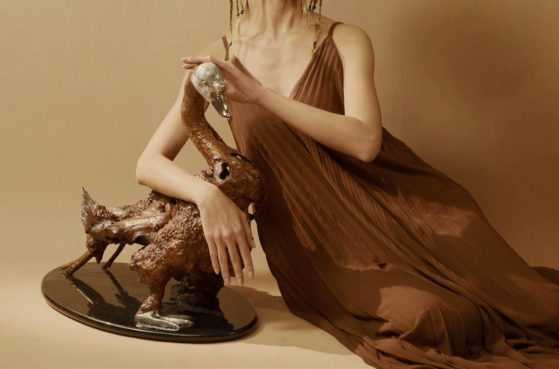 Swan Sculpture, designed from free-form Keyaki wood, embellished with Sterling Silver head, tail and feet. The eyes are decorated with Tiger Eye Quartz.