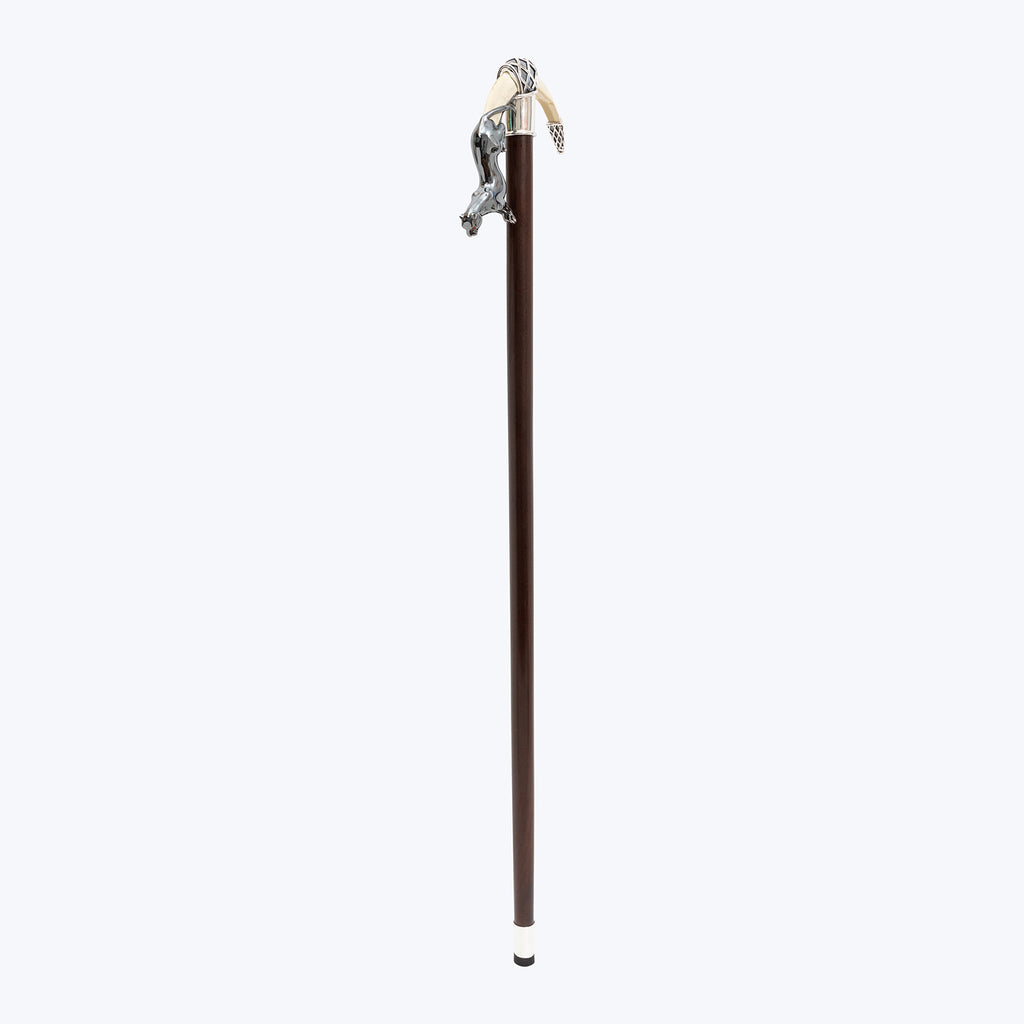 An elegantly designed Silver Jaguar, formed with a replica wild boar fang handle and Red Coral eyes, leaping from atop a Mahogany Cane.