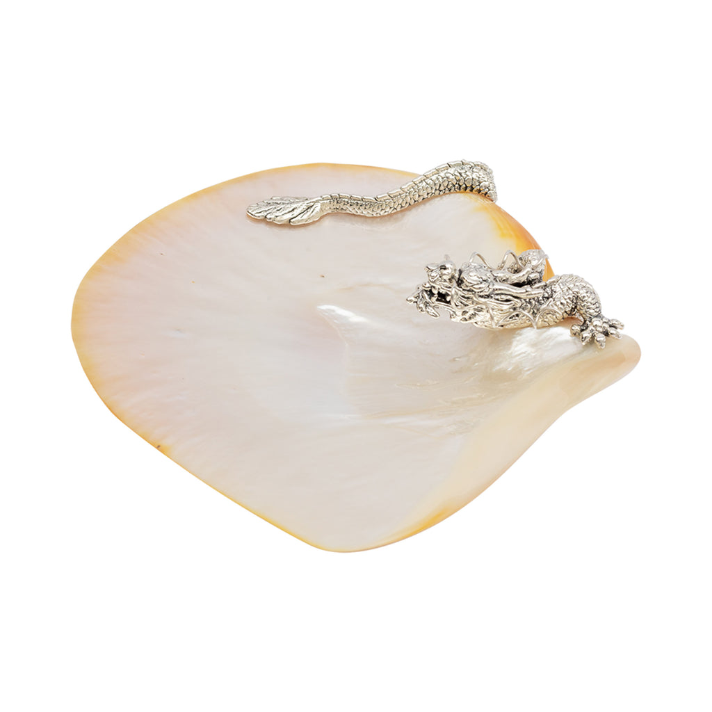 Mother of Pearl Plate, handcrafted from the finest mother of pearls in Southeast Asia, decorated with Sterling Silver Dragon. It is popularly used as a home or office décor but also suited as a formal dining implement. Nestle this iridescent plate for a stunning caviar presentation or host miniature dessert items and various hors d'oeuvres.