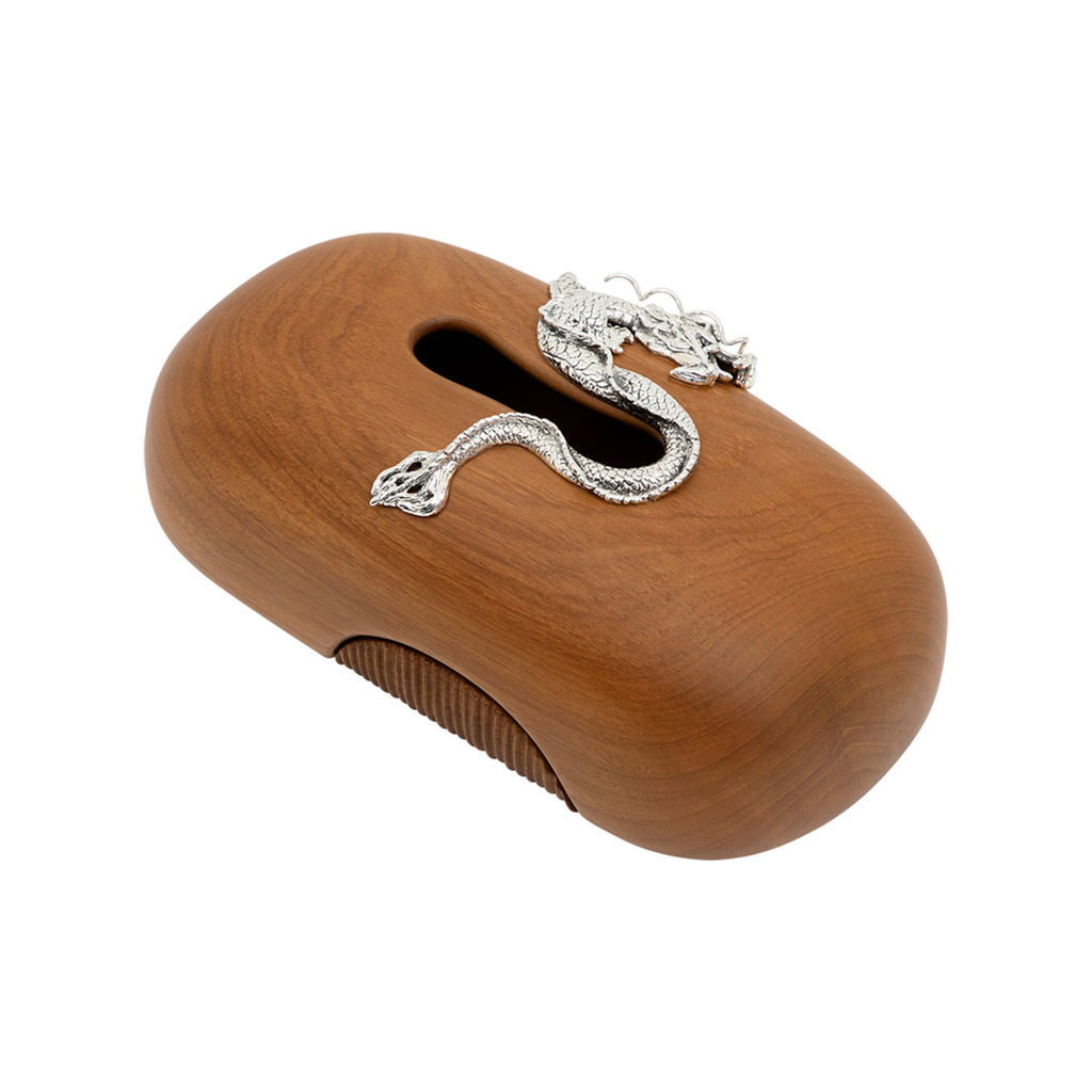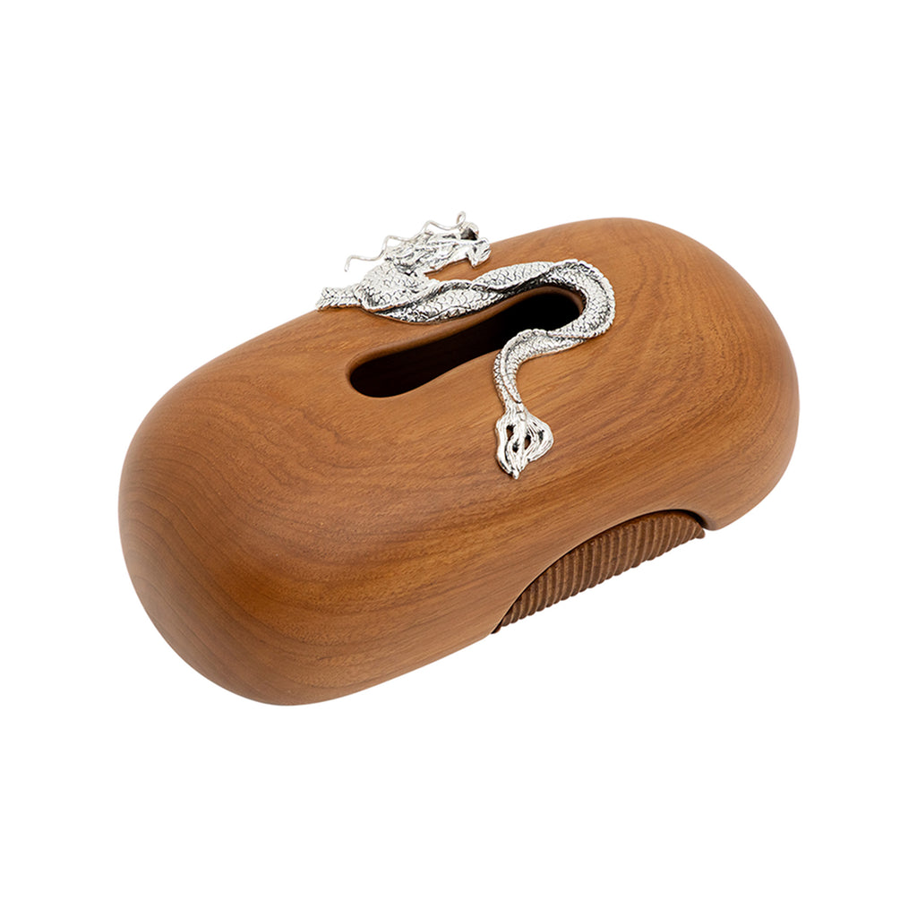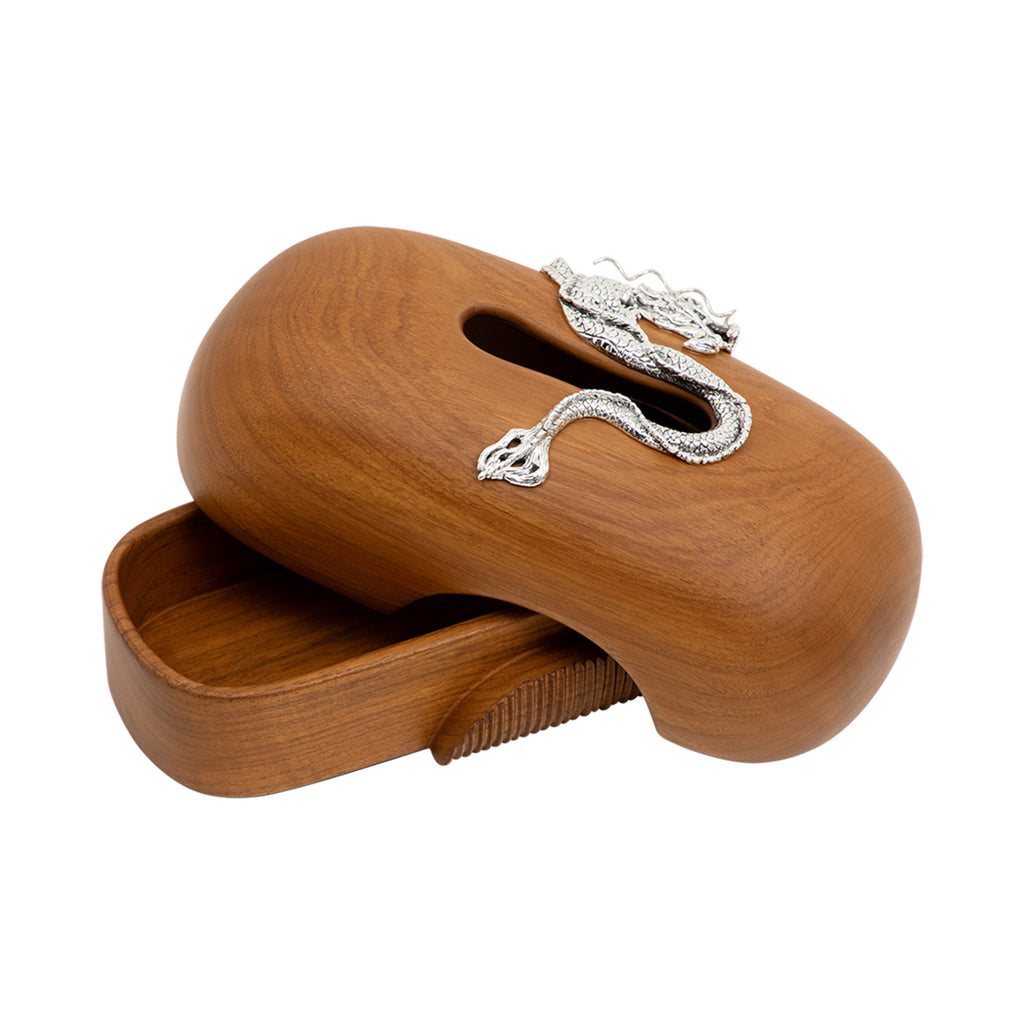 Hand-carved Teak wood tissue box decorated with Sterling Silver Dragon, with intricate details of skilled craftsmanship seen in the texture of the Silver work.