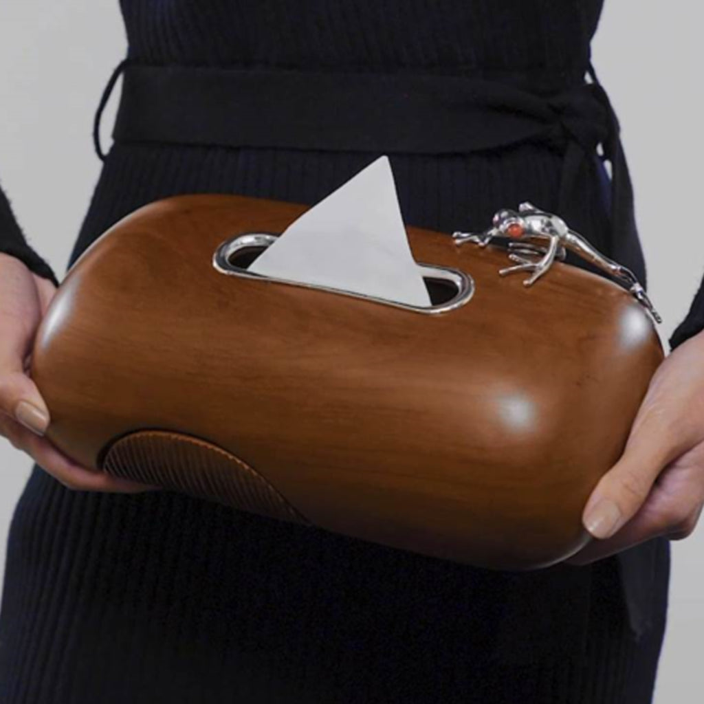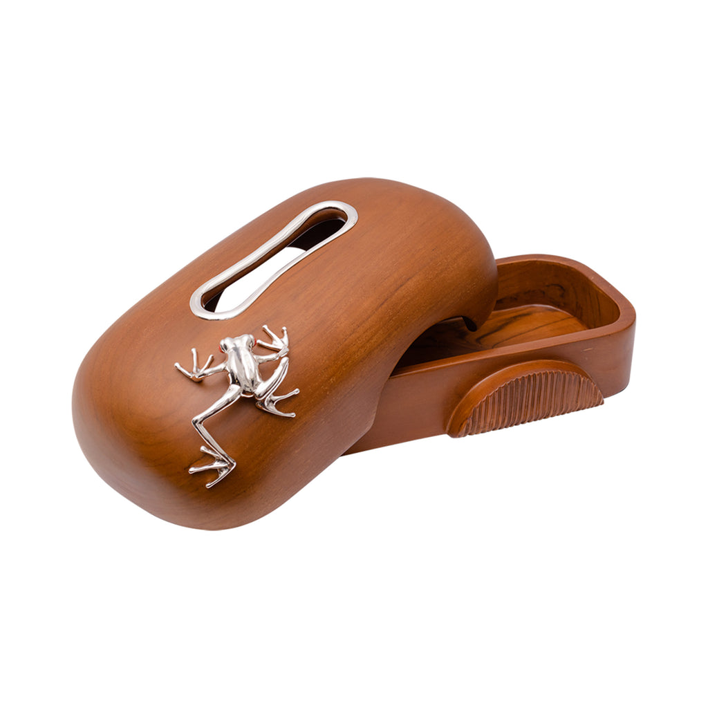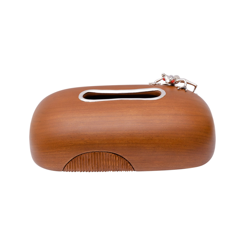 Hand-carved teak wood tissue box decorated with sterling silver frog, with intricate details of skilled craftsmanship seen in the texture of the silver work.