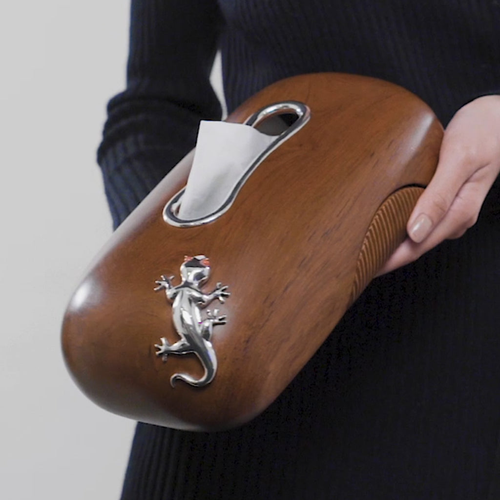 Hand-carved Teak wood tissue box decorated with Sterling Silver Lizard and the rim lined with Sterling Silver. An ideal gift for any occasion.