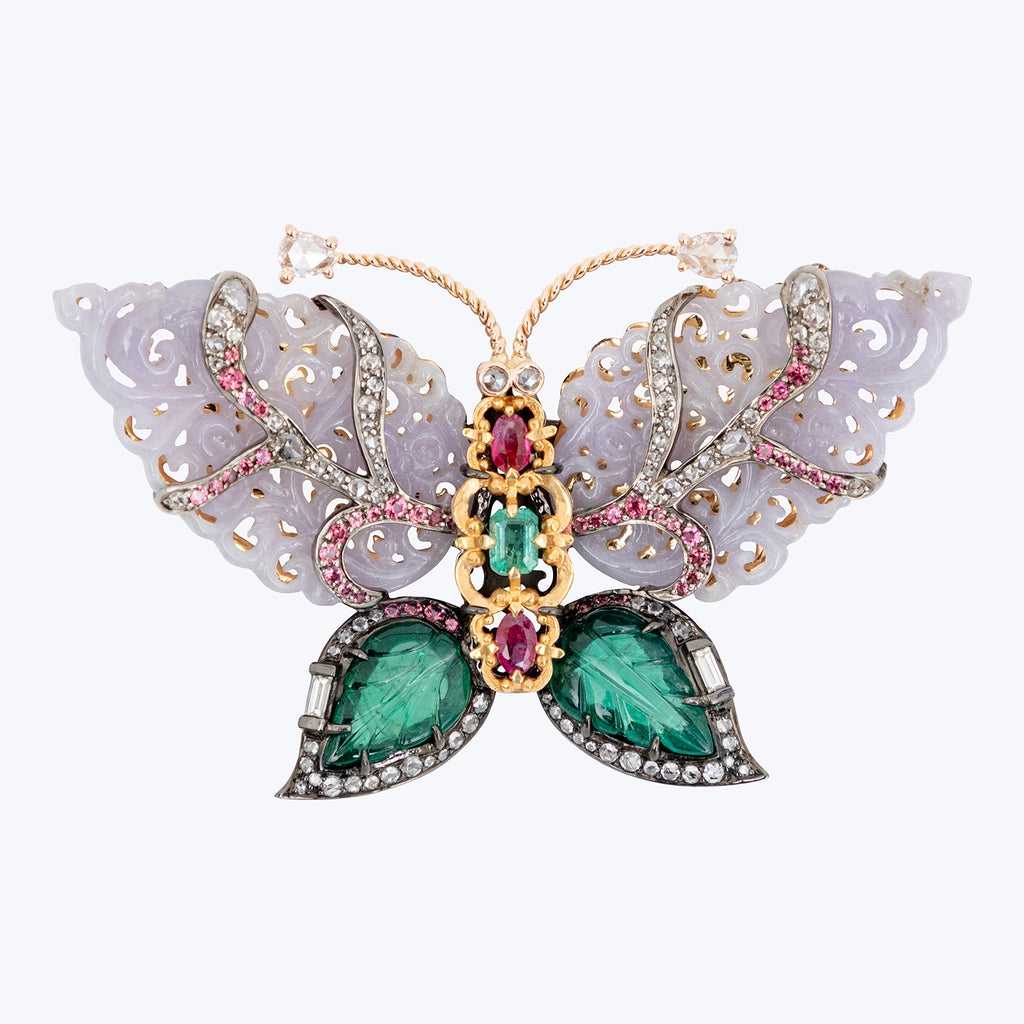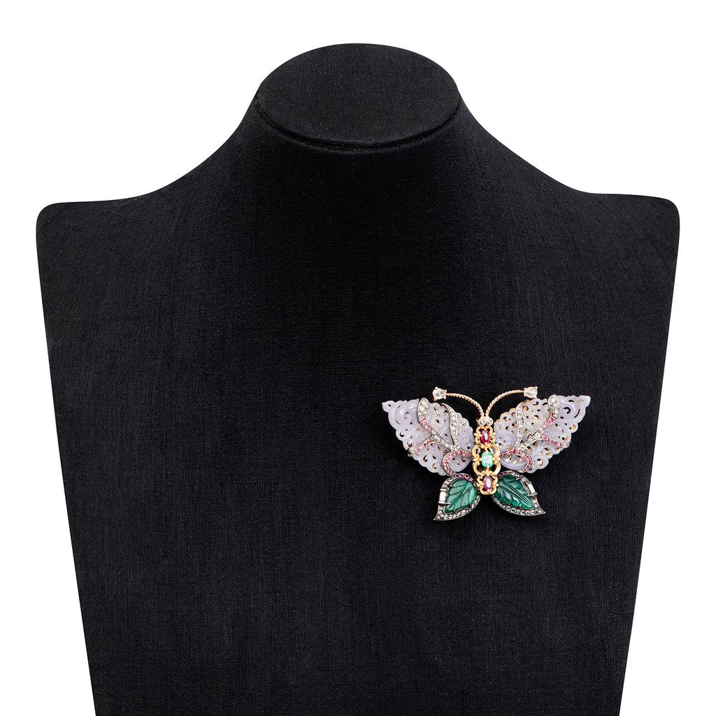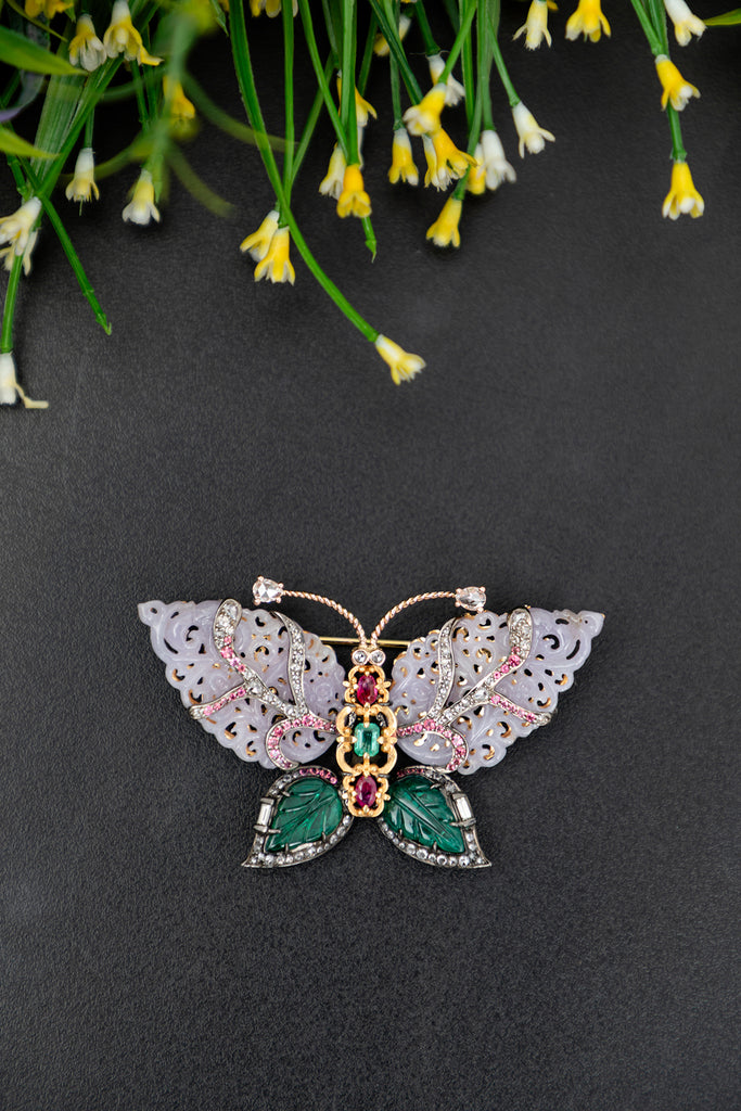 The top wings of the butterfly are masterfully crafted from Burma Carved Lavender Jade, creating a captivating contrast between the soft lavender hues and the antique gold setting. To enhance its allure, Diamonds and Pink Tourmaline gemstones are thoughtfully set in 9K gold, adding a touch of timeless elegance to the composition. On the lower part of the butterfly's wings, a striking silver black rhodium plated design provides a bold backdrop for the brooch. This intriguing contrast creates depth and character to the piece. To complete the captivating design, Natural Zambian Carved Emeralds, round Diamonds, and Baguette Diamonds adorn the lower wings, adding a sparkling and colorful contrast to the black rhodium plating.