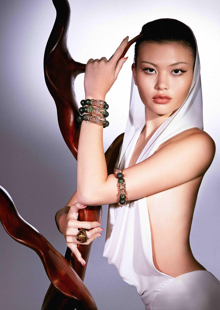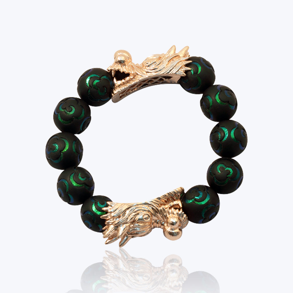 Crafted by skilled artisans, this exquisite bracelet features an inlaid ebony bead adorned with a stunning scarab design and crowned with two pink gold-plated Sterling silver dragon heads. Meticulously molded to capture the essence of yin-yang dualism, these intricately crafted dragon heads showcase the nimble and creative artistry of the creators. The beads themselves are crafted from ebony wood, intricately carved and adorned with hand-cut scarab wings, culminating in a truly majestic and captivating design.