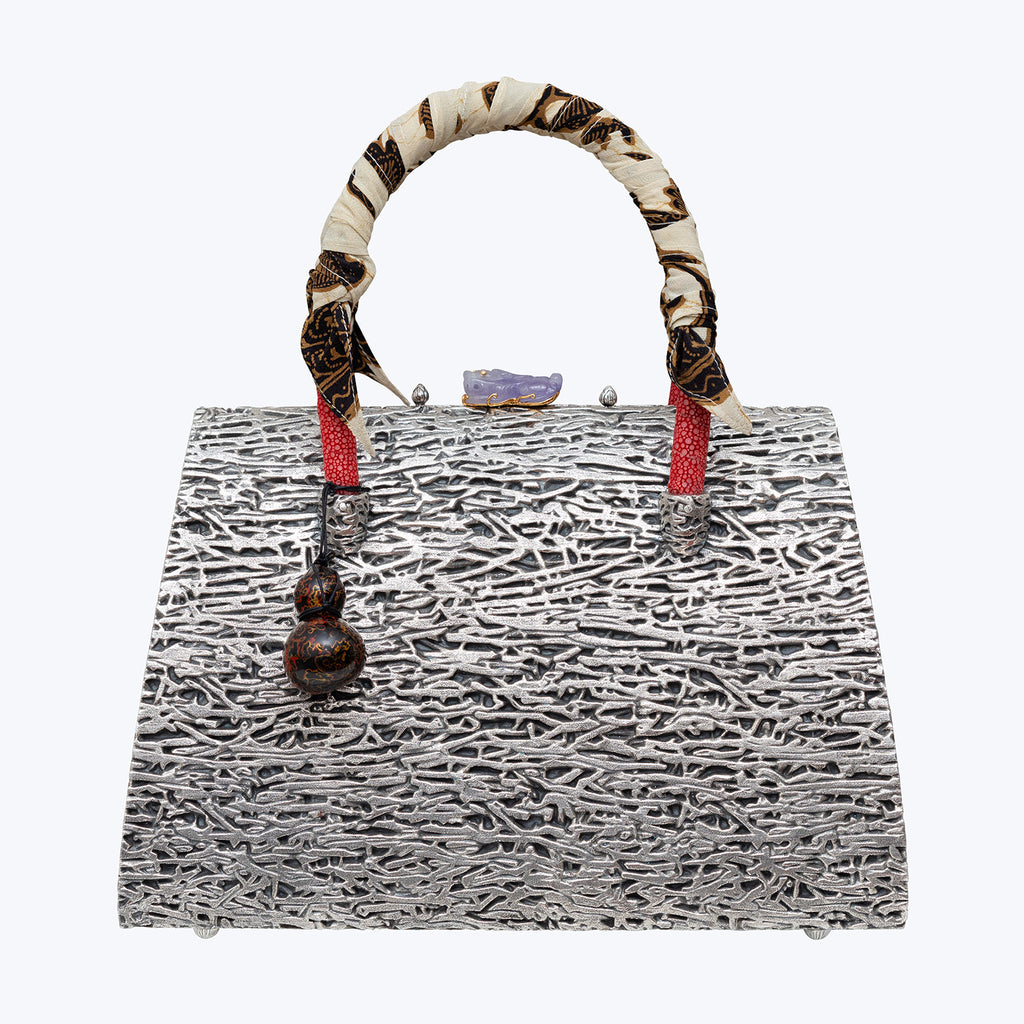 This Silver fern design handbag is beautifully decorated with a carved Lavender Jade Pixiu with Diamond eyes, mounted in Gold Plated Sterling Silver, round-shaped knobs and intricately lined with light pink silk on the inside. The red galuchat leather straps are wrapped with Rembang silk and adorned with a hand painted lacquer gourd.