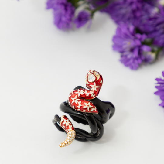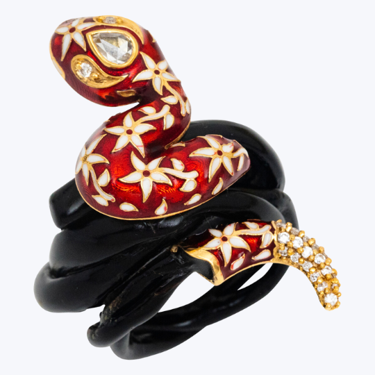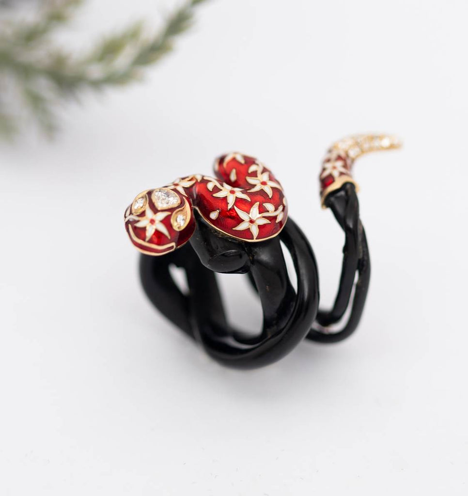 A Stunning Snake Ring hand crafted from polished black wood and rare hot Enamel work then further embellished with 14K gold and Diamonds on the head and tail of the snake. Together with the black wood, it is believed in many cultures to wear it as the protector to chase away the bad luck.