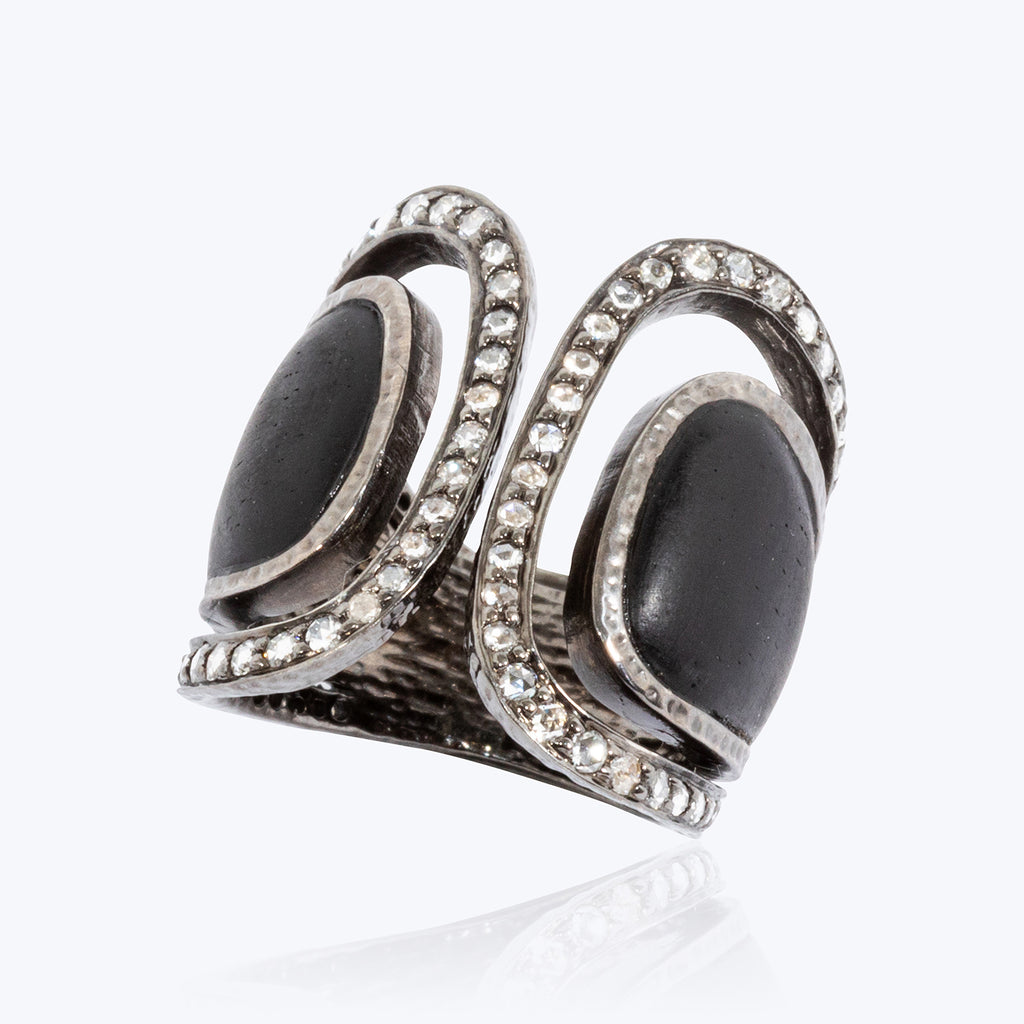 | Hand-carved black wood ring, with a Black Rhodium plated Sterling Silver set with white rose cut Diamonds. The collection drew inspiration from the elegance of the 1930s Art Deco movement. Art Deco or Deco, is an influential visual arts design style that first appeared in France and which borrowed from china. Much larger brands travelled to the east every year and absorbed Chinese style into their art deco designs and the same happened in many fields, whether carpets, or furniture, glass and Chinese porcelain. The style is often characterized by rich colors, bold geometric shapes and lavish ornamentation. Rose Cut White Diamond: 0.664 carat. Dimension : 2.2(L) x 2.3(W) x 2.1(H) cms. Weight: 10.76 gms. |