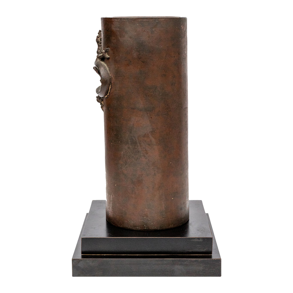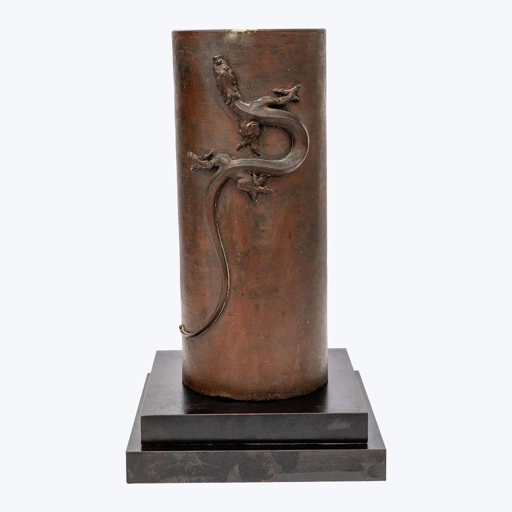 This exquisite holder or vase is crafted from bronze and adorned with an intricately detailed relief of a dragon. The dragon's long, sinuous body wraps around the cylinder, showcasing its scales and claws in a captivating design. The bronze material imparts a timeless and elegant look to the piece.
