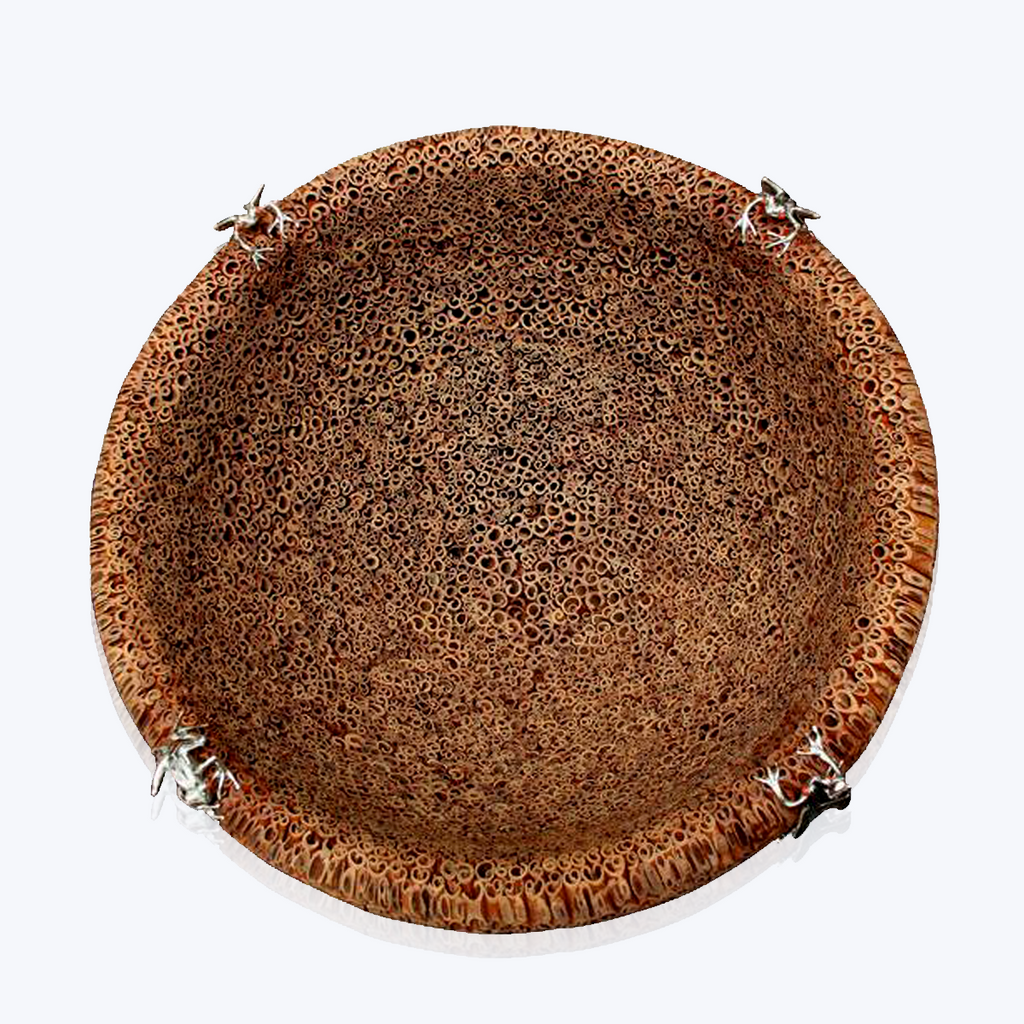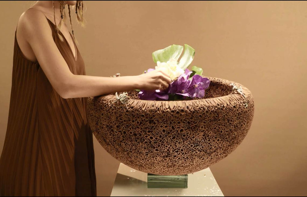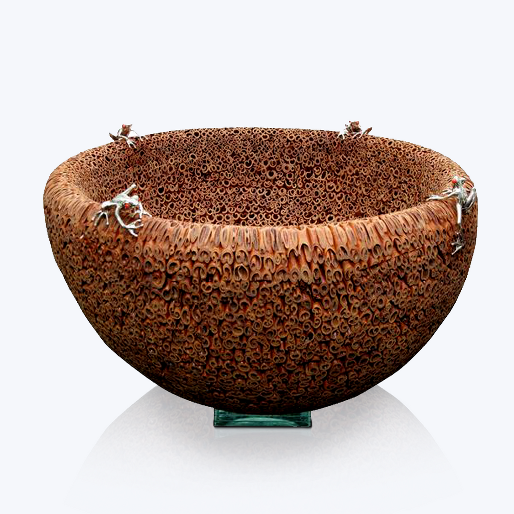 This art piece is hand formed by thousands of cinnamon sticks, cut, and shaped into a large round bowl.