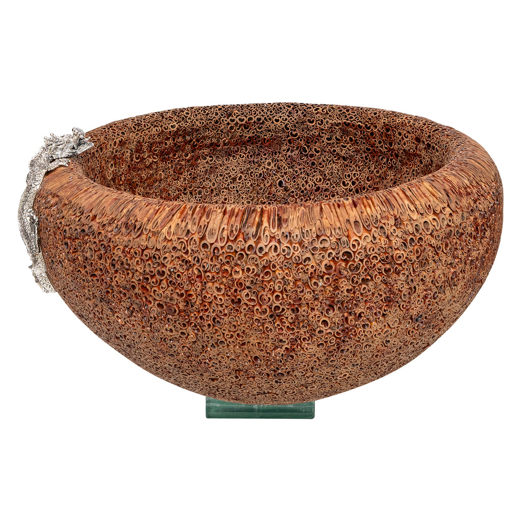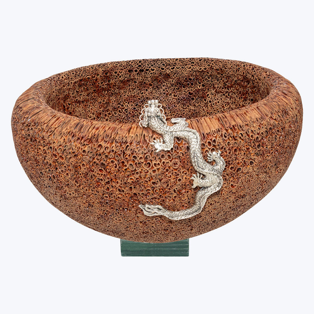 | Intricately cut and assembled Cinnamon sticks transformed into a Bowl, decorated with relaxed Sterling Silver Dragon. The bowl comes with glass base and Cinnamon oil for upkeep its fragrance. The bowl is ideal as a large fruit basket, to arrange flowers with or used at the entrance of hallways to keep keys and accessories. This piece with nearly 1,000 cinnamon sticks took over a month to assemble by over 4 craftsmen in Bali, Indonesia. Thereafter with 6 designers and Silversmiths worked on the Silver decor, taking another 4 weeks of work to complete this elegant design. The Cinnamon bowl is an artwork by Seiki Torige. This Japanese glass master is famous for his mouth-blown glass vases, statues, and gargantuan sculptures. Some of which have weighed in excess of 1000 kilos and measured up to 40 meters in length, which are coveted by collectors worldwide. Dragons traditionally are the embodiment of primordial power, the ultimate ruler of all the elements - Fire, Water, Earth, and Wind. It is the fifth of the 12 Chinese zodiac animals and associated with the Earthly branch symbol 辰, pronounced chen. As a totem, the Dragon serves as a powerful guardian and guide and is a symbol of good luck for people who are worthy of it in East Asian culture. Size: 61(W) x 61(L) x 38(H) cm. Weight: 26 kg. |