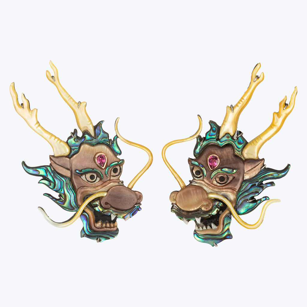A pair of Dragon earrings, designed with intricately carved abalone shell and mother of pearl, adorned elegantly tiny pearls set in Silver. Adding a touch of vibrancy, Pear Rubellite are set in sterling silver with yellow gold plate in the dragon's eye, infusing the artwork with life and character. Despite their generous dimensions, these earrings retain a remarkable lightweight quality, ensuring comfort and joy for every wearer.