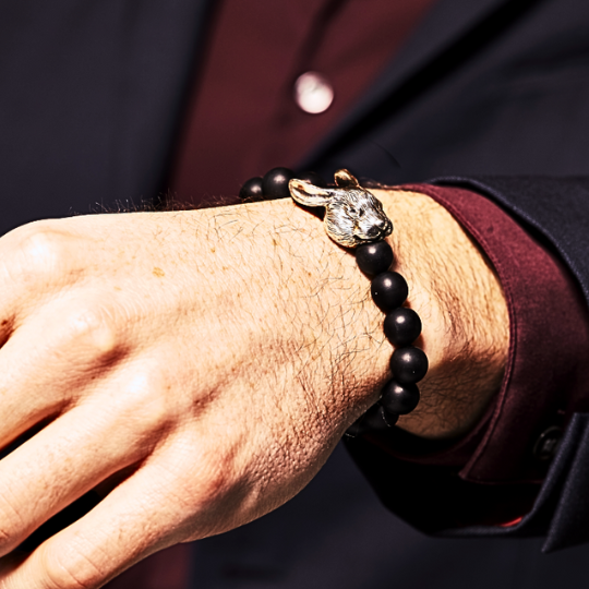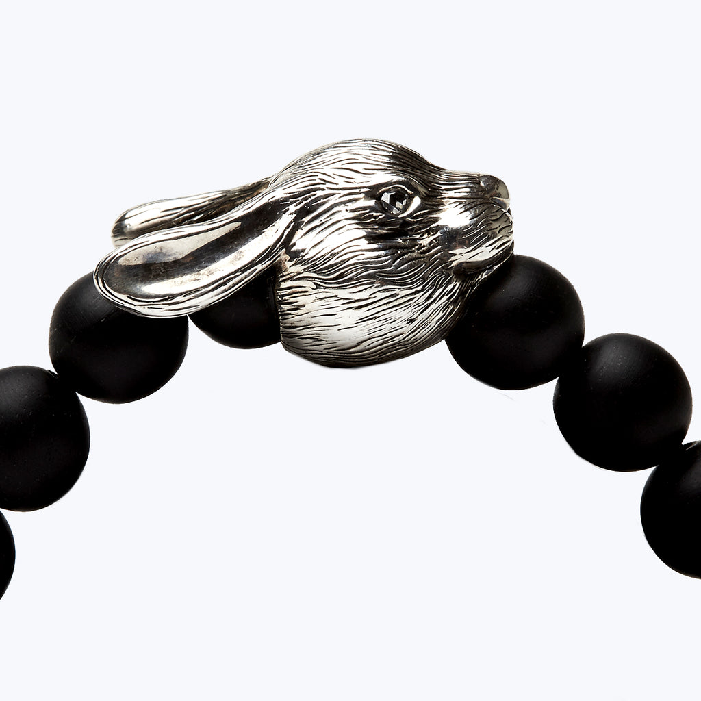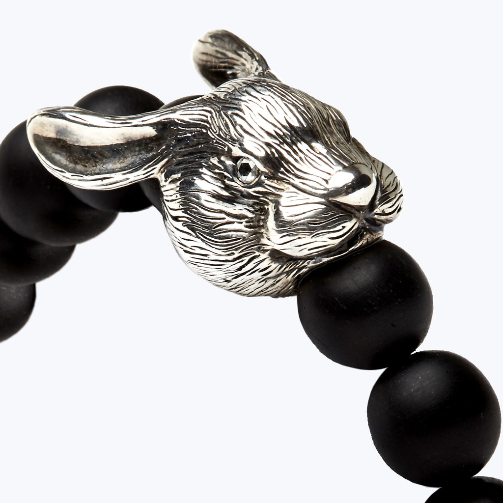 | Mala Bread Bracelet, crafted with fine Ebony Wood decorated with Sterling Silver Rabbit, set with sparkling Diamonds in eyes. Mala beads (or prayer beads) are the rosary beads commonly used by Mahayana Buddhists, and Hindus for the spiritual practice known in Sanskrit as japa. It is usually made from 108 beads, though other numbers are also used. These beads are used for keeping count while reciting, chanting, or mentally repeating a mantra or the name or names of a deity. It is known to have a great significance in Buddhist Regions of Asia in the form of good health and spiritual well-being to the owner. The rabbit is the fourth animal in the Chinese zodiac. In the Chinese culture, the rabbit is known to be the luckiest out of all the twelve animals. It symbolizes mercy, elegance, and beauty. People who are born in the year of the rabbit are calm and peaceful. It takes approximately 4-6 weeks to create this piece with over 6 designers and craftsmen involved. Size: 5.5" 2 Rose-cut White Diamonds: 0.047 ct. Weight: 21.29 gms. |