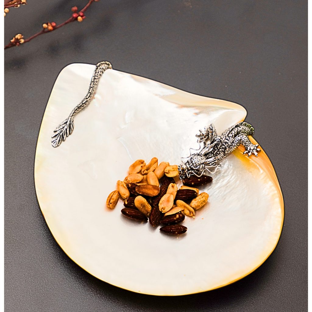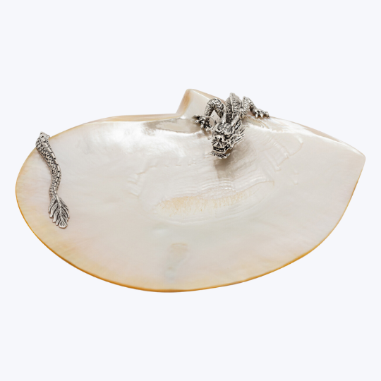 Mother of Pearl Plate, handcrafted from the finest mother of pearls in Southeast Asia, decorated with Sterling Silver Dragon. It is popularly used as a home or office décor but also suited as a formal dining implement. Nestle this iridescent plate for a stunning caviar presentation or host miniature dessert items and various hors d'oeuvres.