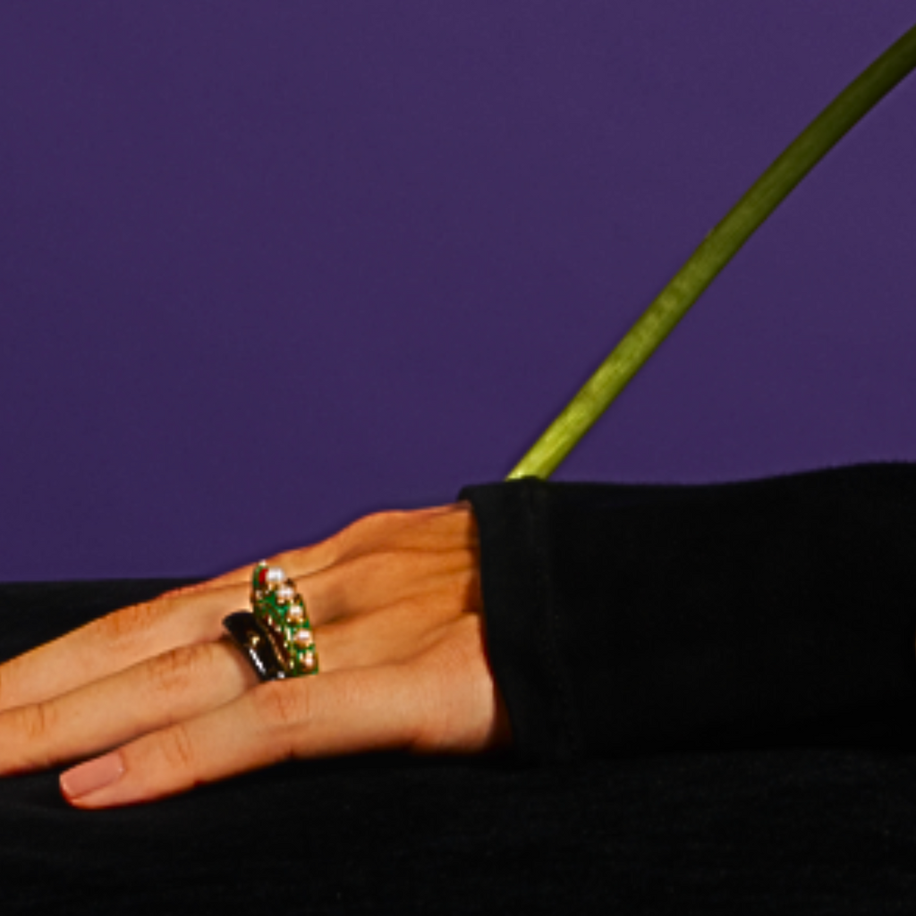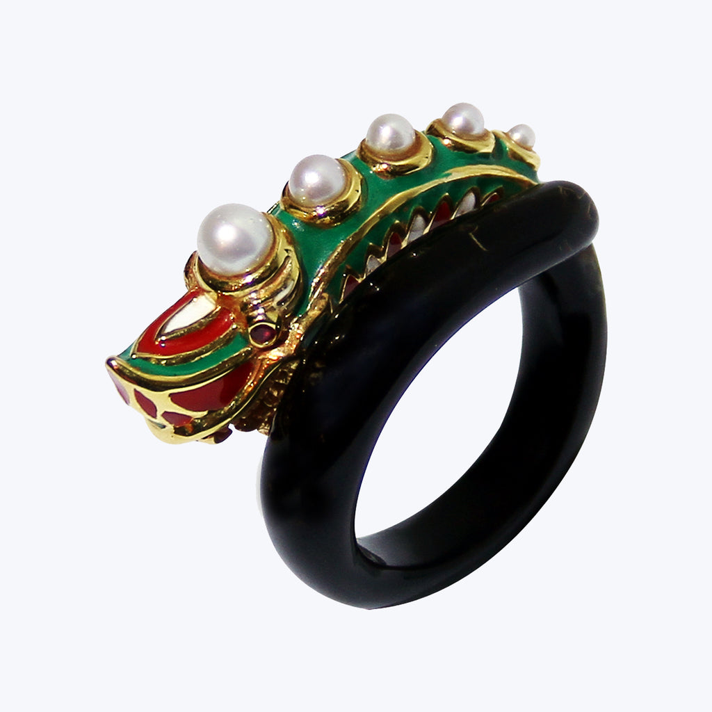 18K gold and mina naga ring is composed of polished blackwood, pearls and ruby eyes design by Lotus Arts de Vivre.