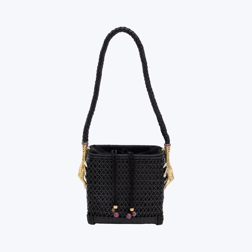 A perfect blend of craftsmanship and modern design by Lotus Arts de Vivre. Woven rattan box-handbag embellished with Gold plated Silver Chicken feet, Pink Tourmalines and Mother of Pearl finger nails.
