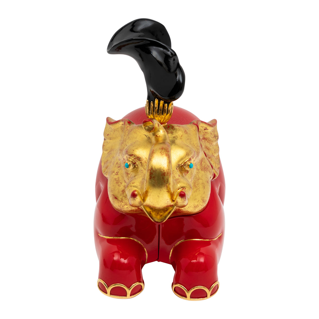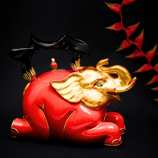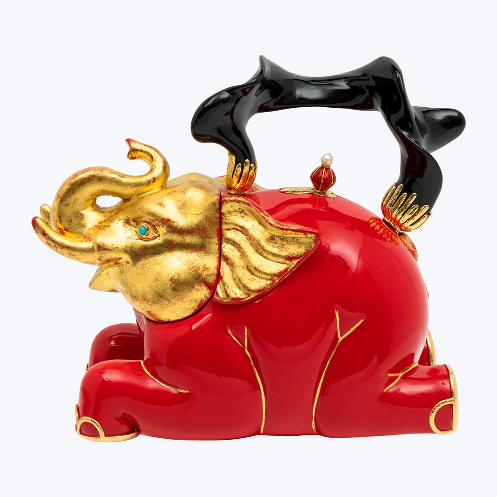 A gorgeously lacquered elephant bag, designed beautifully in contrasting shades of Red lacquer and 24K Gold leaf on red lacquer as an antique look. A fiber glass handle lacquered in black is held onto the bag and accents of the bag has been done in gold plated sterling silver. The bag has been lined in textile.