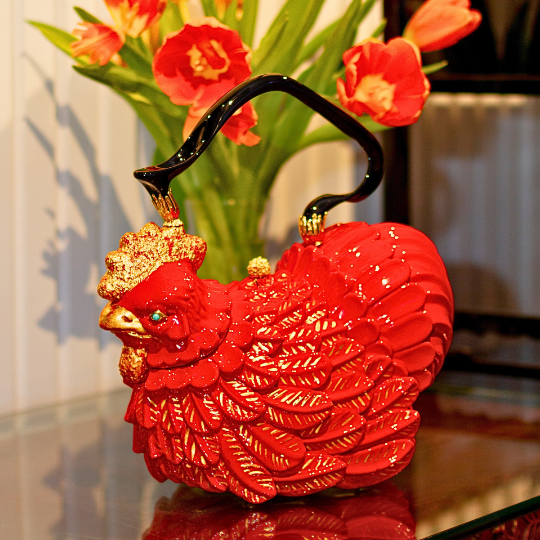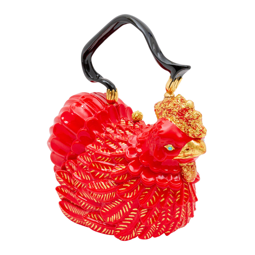 Considered to be outgoing and overconfident, the Rooster is a perfect representation for those with the desire to carry this Cock Handbag. This Red Lacquer Rooster with patina Gold Leaf details and highlights of gold in its plumage of feathers has piercing Turquiose stone eyes set in Gold. The Black Lacquer handle, inspired by nature's 'Crazy Wood', joins the body with gold plated Sterling Silver petal design.