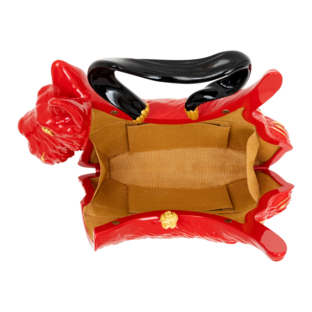 The Scottish Terrier is independent, confident and a loyal companion. Our Golden haired Red Lacquer Scottie Handbag is your new best friend to accompany you with your essentials throughout the day. The Black Agate eyes sparkle in their Gold setting, replicated with the Black Lacquer handle, inspired by nature's 'Crazy Wood', that joins the body with Gold plated Sterling Silver petal design. The opening clasp is a golden Rudraksha bead, spiritually affiliated to our mind and body's health, happiness and prosperity.