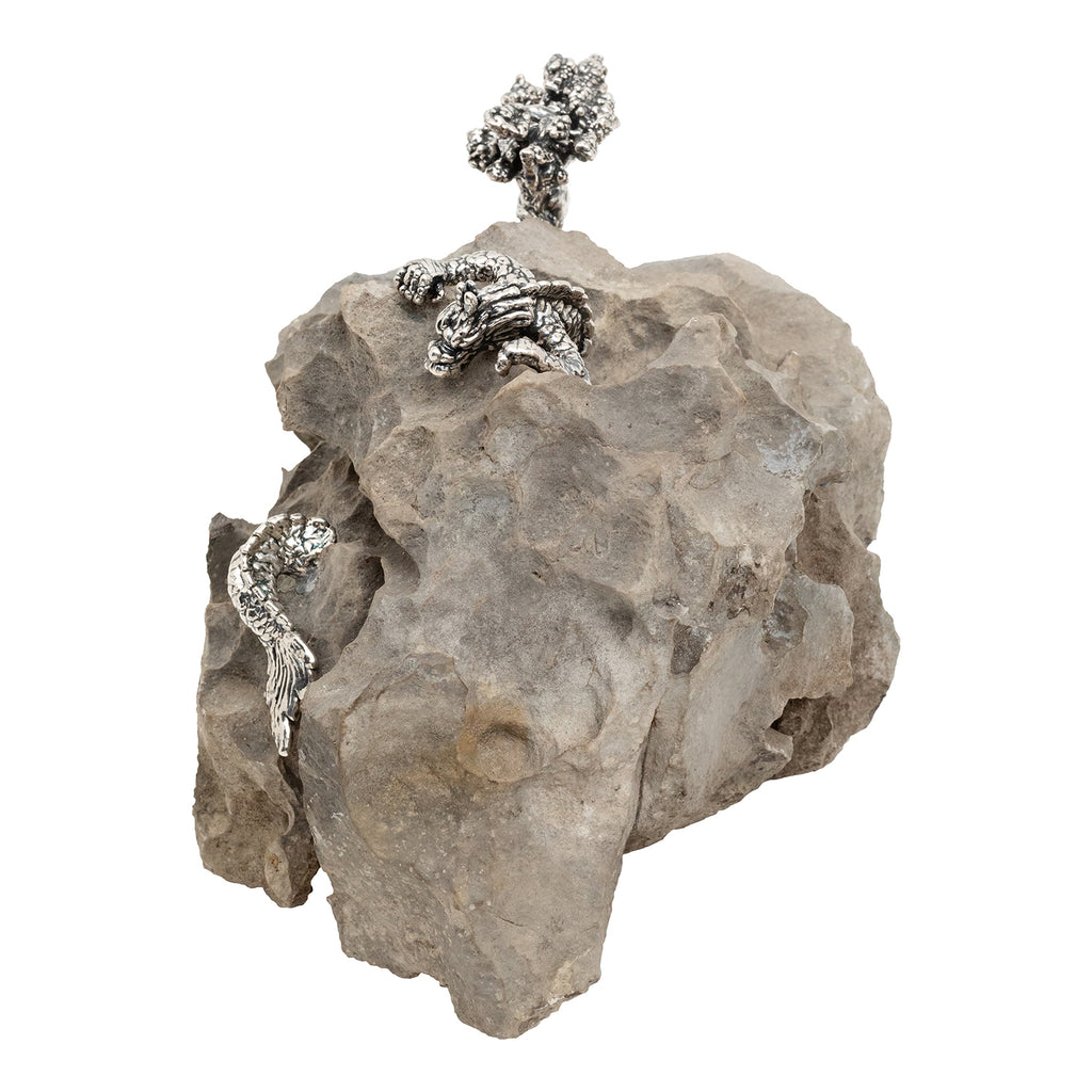 A stone adorned with a sterling silver bonsai tree and a swirling dragon. This captivating piece seamlessly blends the tranquility of the bonsai with the dynamic energy of the dragon, symbolizing of power, strength, and good luck.