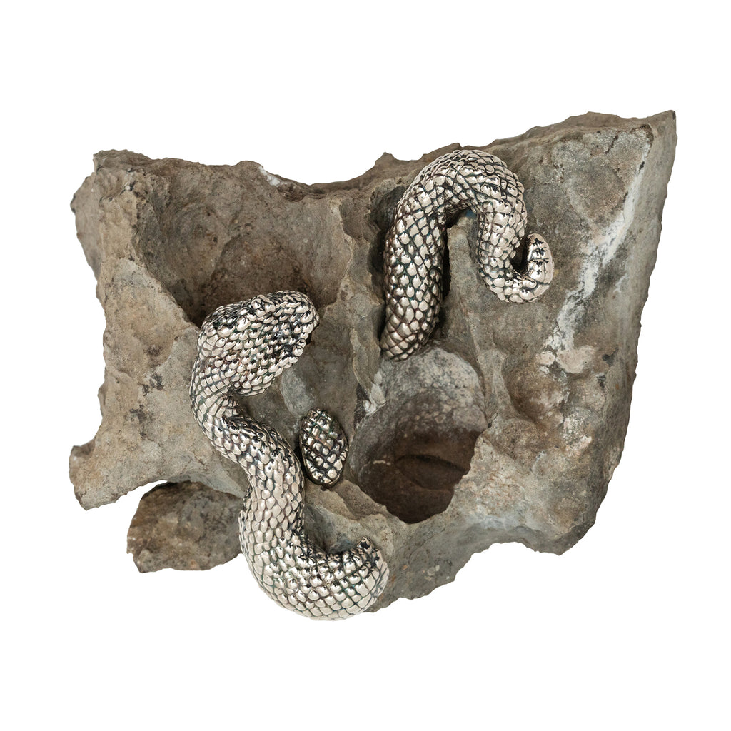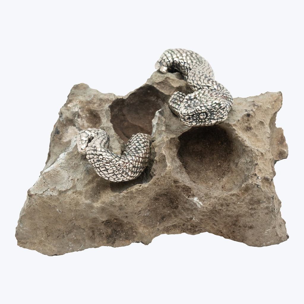 A stone adorned with a sterling silver sinuous snake. This captivating piece seamlessly blends the tranquility of the bonsai with the dynamic energy of the snake, symbolizing harmony and balance.