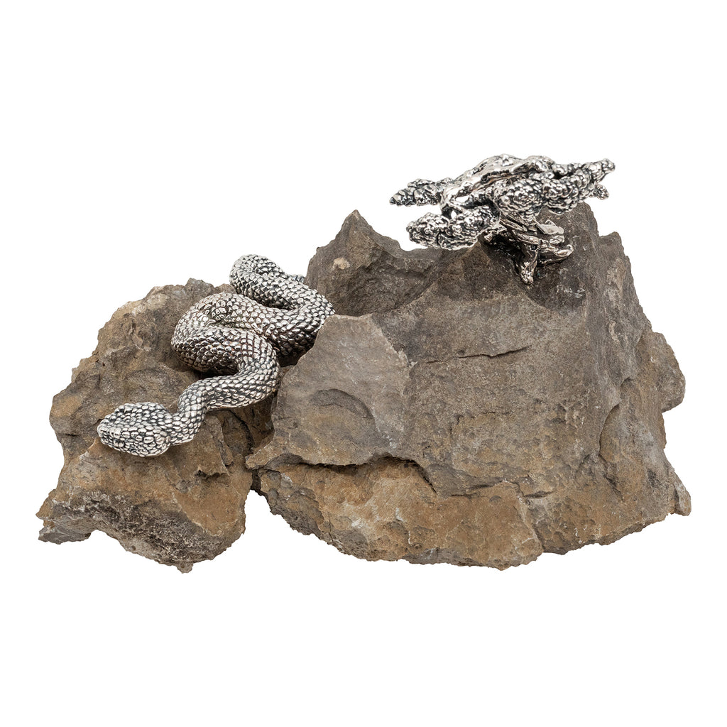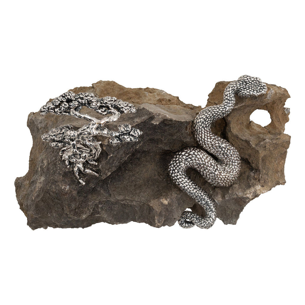A stone adorned with a sterling silver bonsai tree and a sinuous snake. This captivating piece seamlessly blends the tranquility of the bonsai with the dynamic energy of the snake, symbolizing harmony and balance.