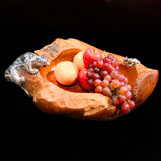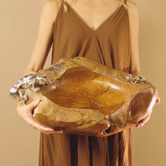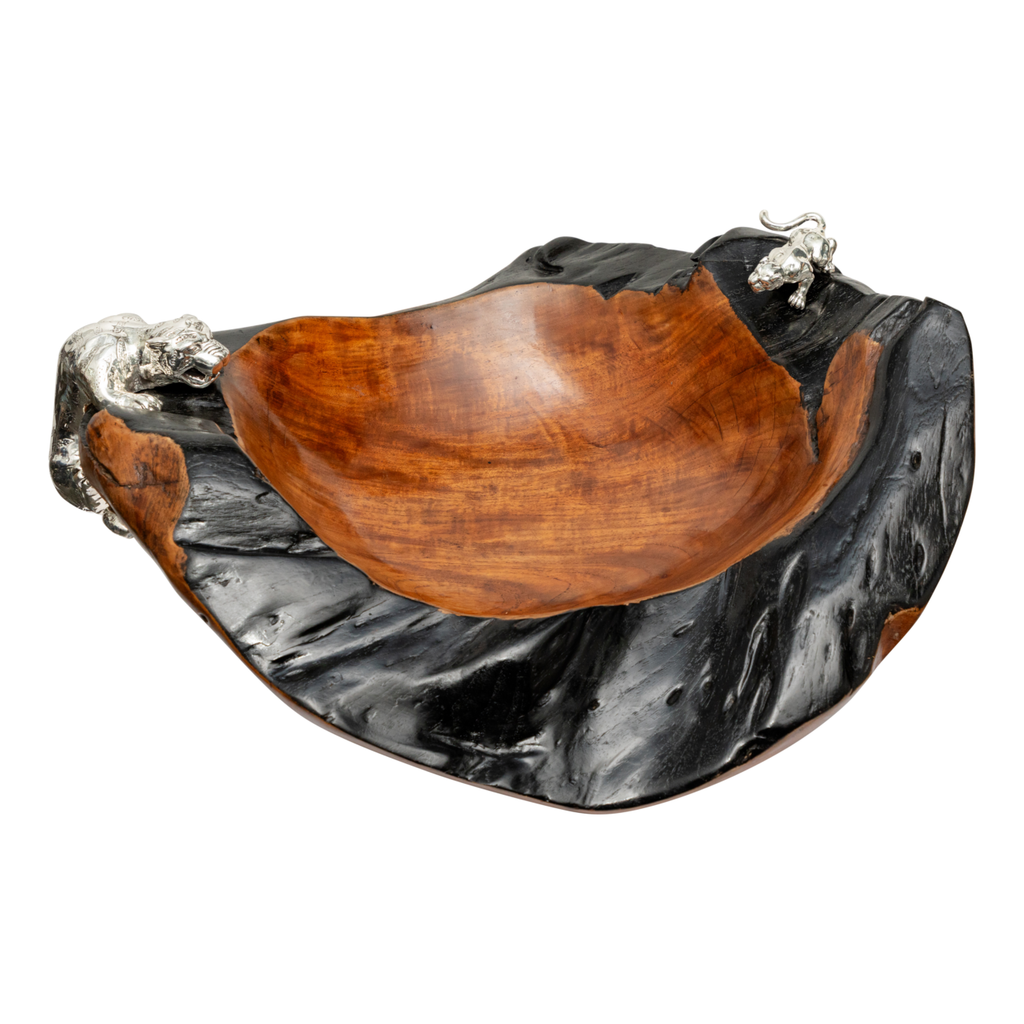 Wooden bowl, carved from Teak root wood and decorated with a symbolically powerful Sterling Silver Tiger. This bowl is a perfect show piece at a party setting or unique decorative centerpiece for a luxury drawing room. Ideal for keeping fruits and decoratively recommended to be arranged with fruits or dried flowers.