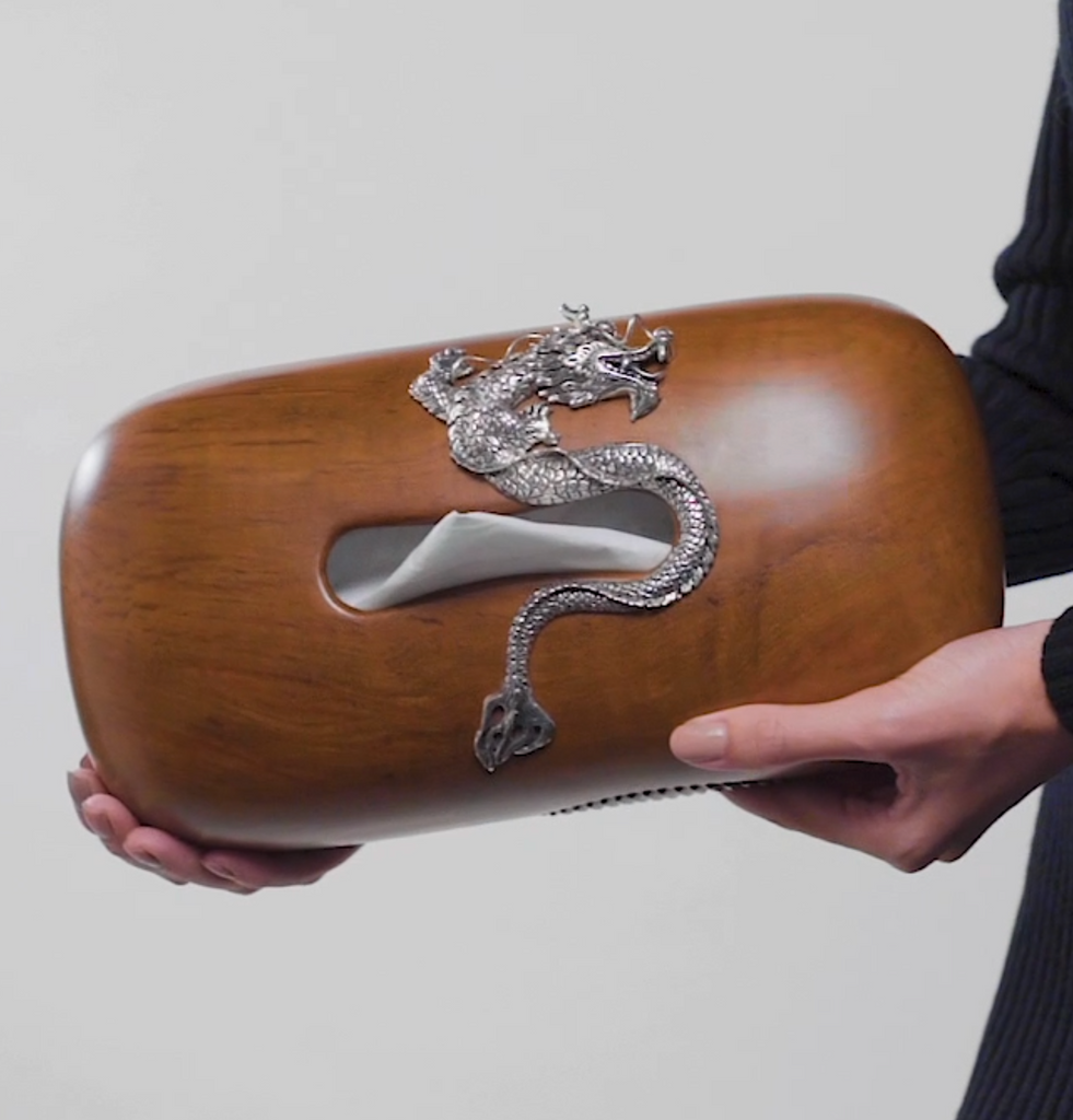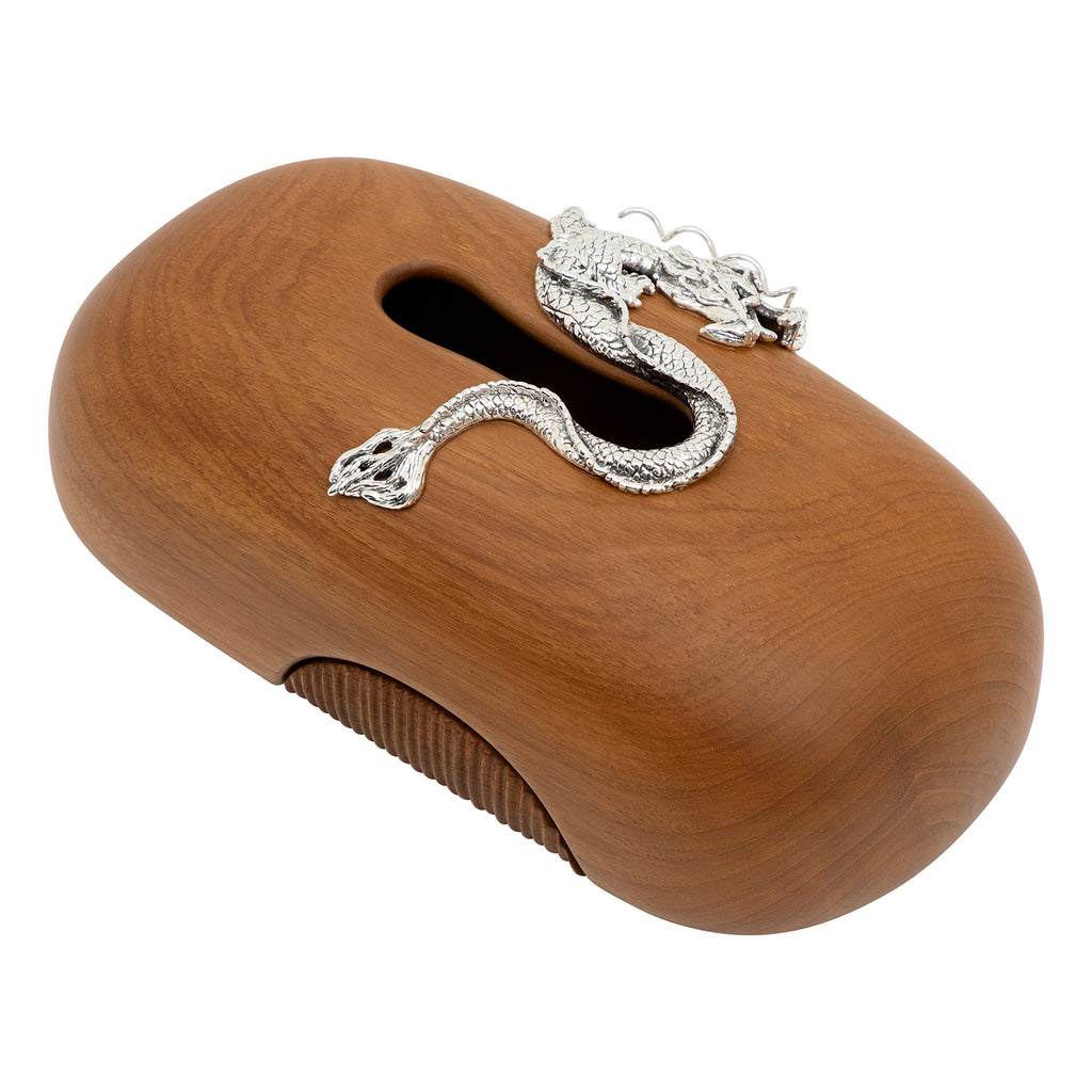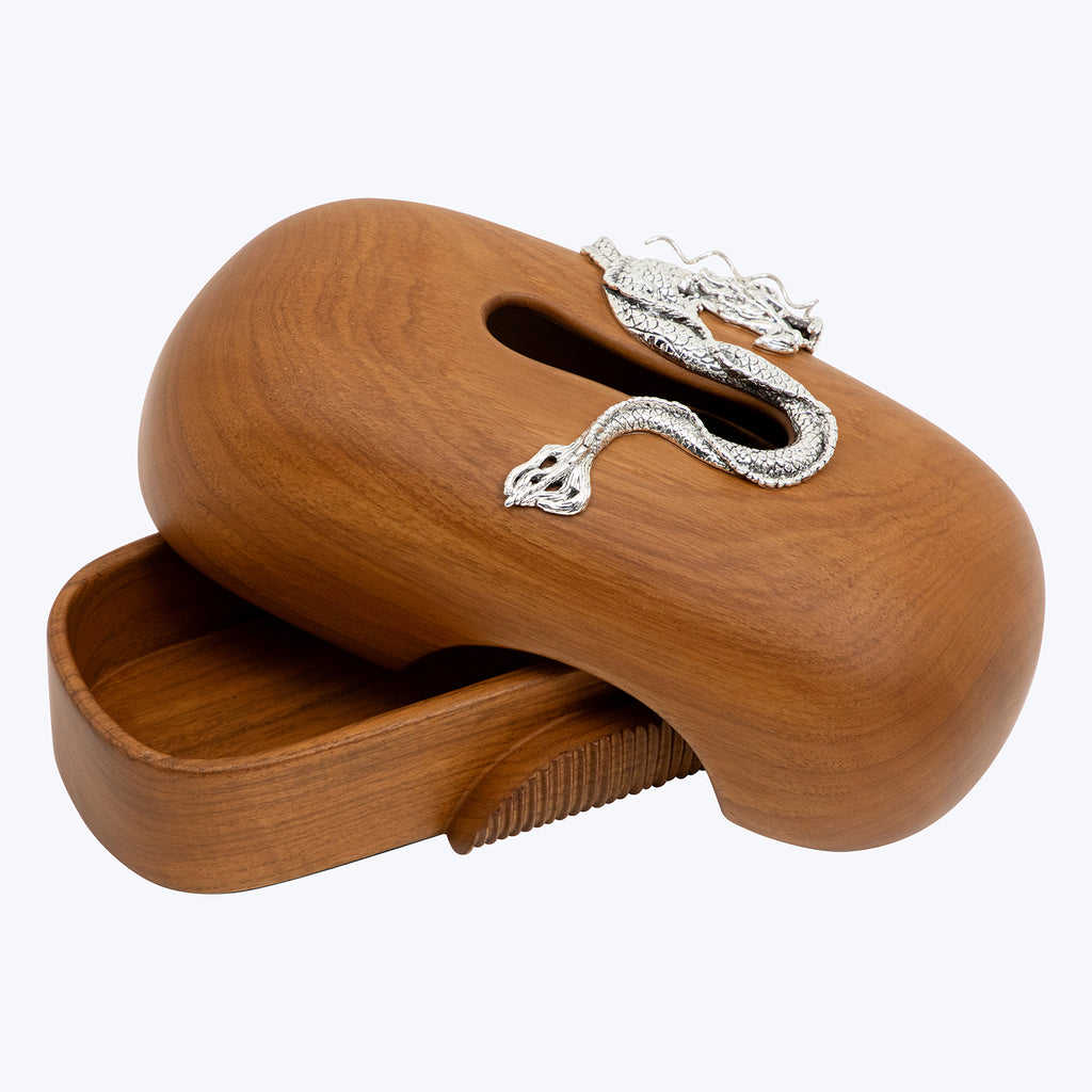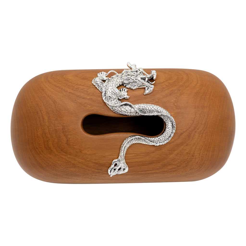 Hand-carved Teak wood tissue box decorated with Sterling Silver Dragon, with intricate details of skilled craftsmanship seen in the texture of the Silver work.