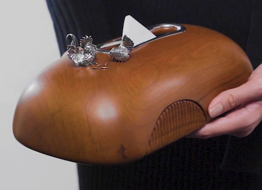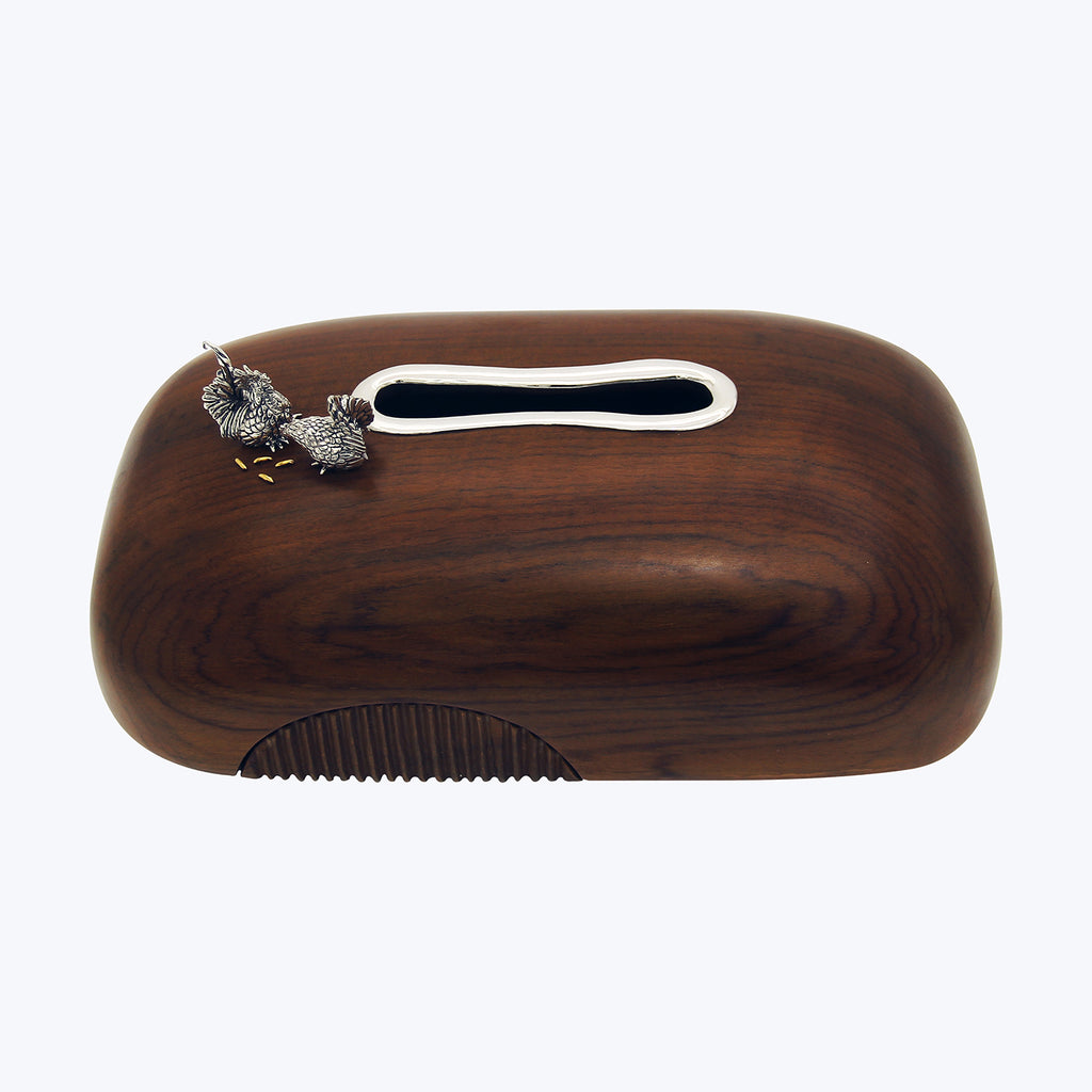 | Hand-carved teak wood tissue box, decorated with Sterling Silver Rooster. Teak is the common name for the tropical hardwood tree species Tectona grandis and its wood products, native to South and Southeast Asia and continues to be rare to find. Lotus Arts de Vivre uses various free-formations of the teak branches, teak root or drift wood to further hand-carve and create its designs. It took more than 1.5 months to create this piece. Size: 15(W) x 29(L) x 13.5(H) cms. Weight : 900 gms. |