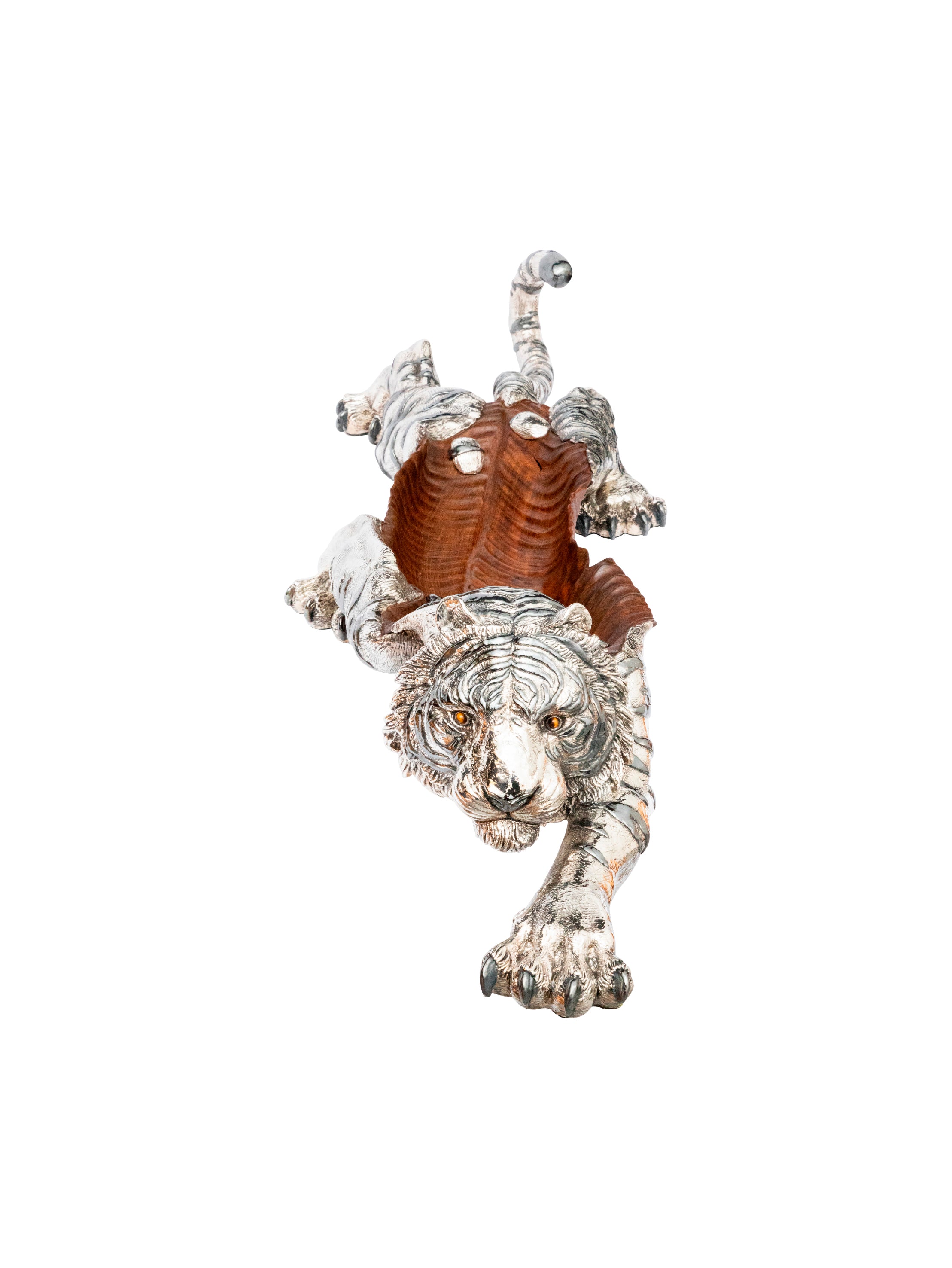 A majestic teak wood and Sterling Silver tiger sculpture, handcrafted to perfection for a discerning client's unique abode. This stunning piece seamlessly transitions from a striking centerpiece to a functional serving bowl, perfect for showcasing fresh fruits or elegant flower arrangements, adding a touch of luxury to any sophisticated living space.