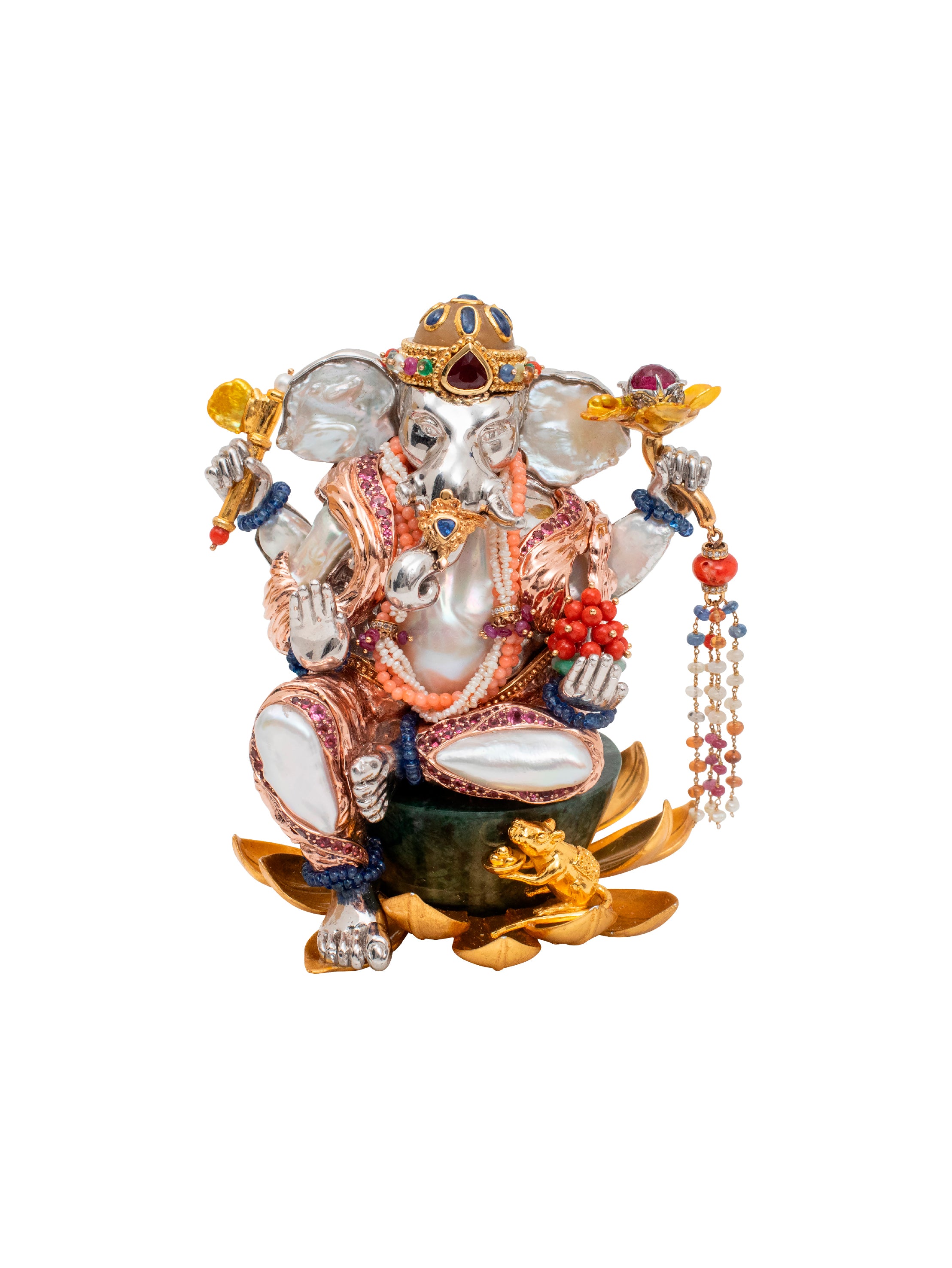 Exquisite 24K gold Ganesha sculpture adorned with free-form pearls, precious gemstones, and 9K gold. Seated on a green marble base with a 24K gold-plated 'Mushika' rat and sterling silver lotus flower, this masterpiece radiates elegance and spirituality. Symbolising the remover of obstacles, Lord Ganesha's divine attributes shine through intricate details and opulent materials.