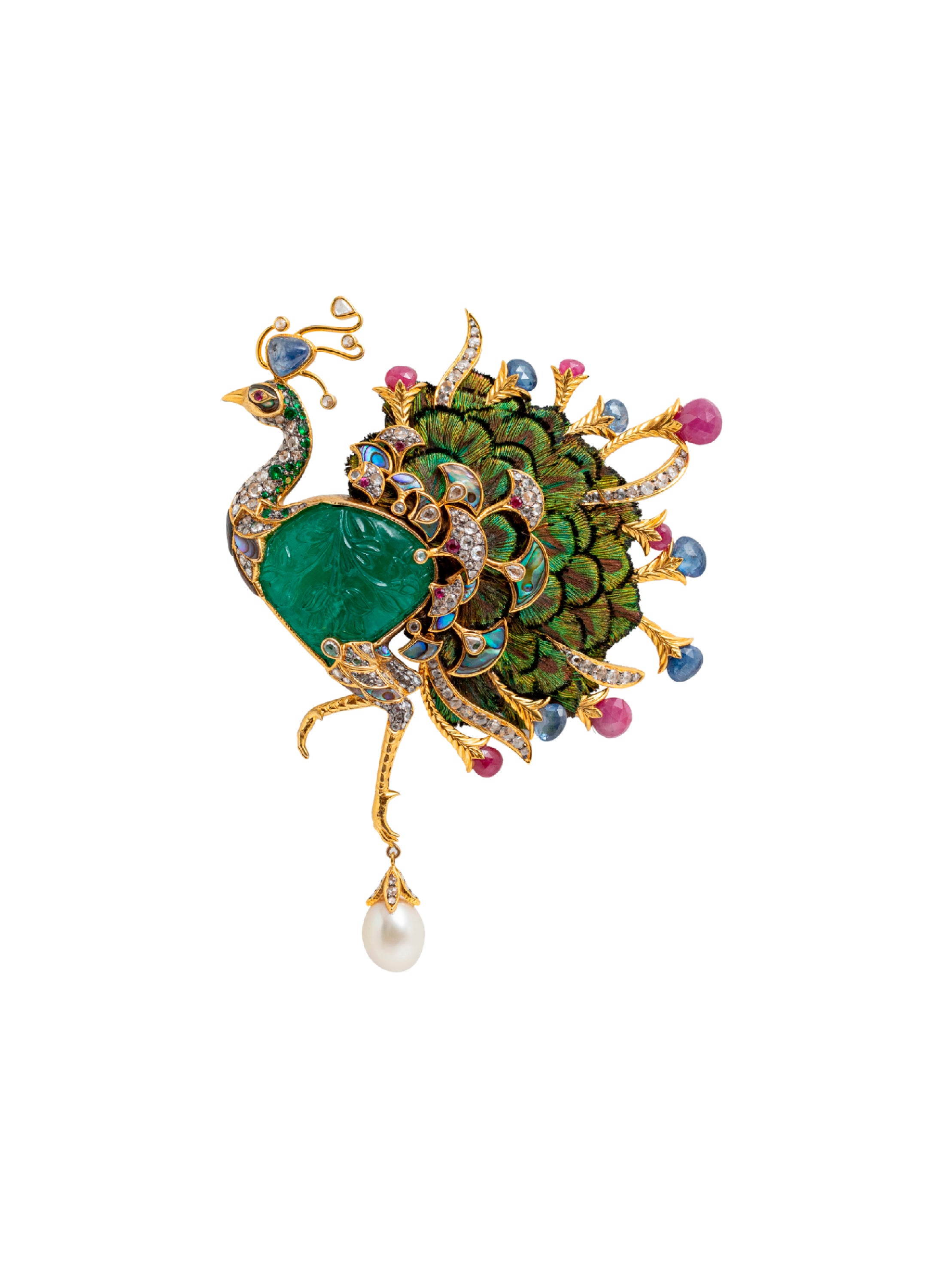 A majestic peacock brooch, meticulously crafted with a kaleidoscope of precious stones and shells around a stunning Russian emerald. Diamonds, tsavorites, rubies, and sapphires dance across 18K gold, complemented by iridescent abalone shells and authentic peacock feathers, bringing this regal bird to life.