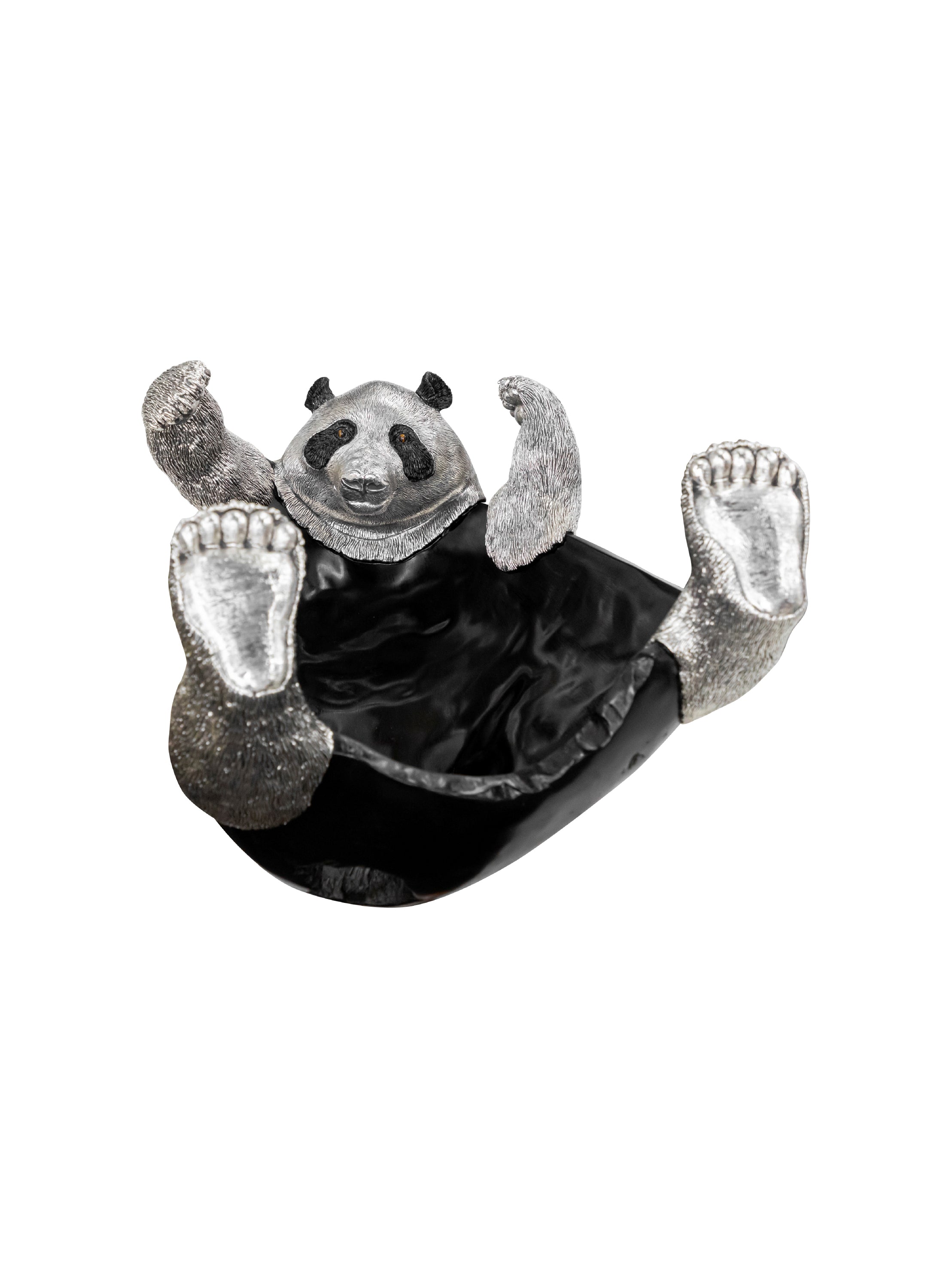 Handcrafted from a single piece of ebony wood, this panda bowl features silver details and black onyx eyes. A stunning sculpture that doubles as a functional fruit bowl, it has brought joy to a discerning client's home, where it's a beloved plaything for their grandchildren. Inspired by the iconic giant panda, its striking black and white hues evoke the majestic creature's natural beauty.