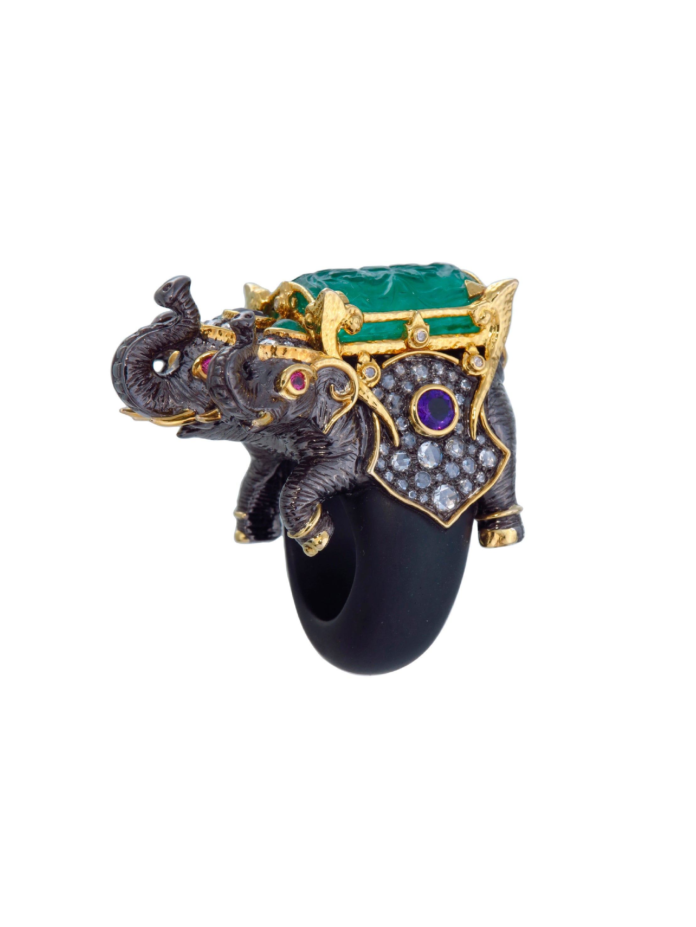 Magnificent blackwood Erawan ring, adorned with carved Russian emerald, amethysts, diamonds, and rubies, set in 18K gold and sterling silver. Inspired by the mythical three-headed elephant Airavata, symbolising power and majesty in Thai culture.