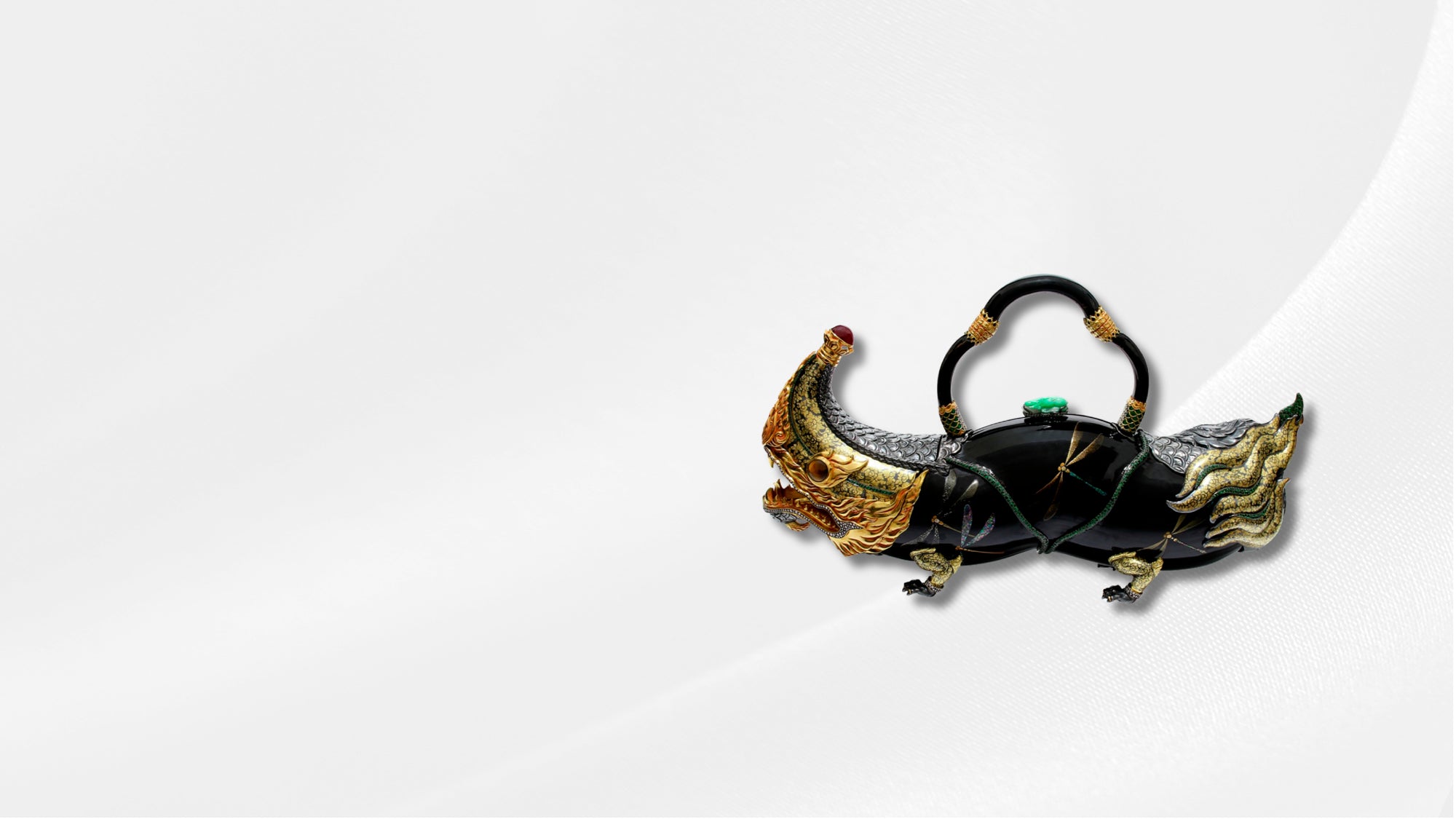 An exquisite Naga Handbag meticulously handcrafted from Japanese bamboo and adorned with stunning Japanese lacquer artwork, intricate Thai niello work, lustrous black silk, pearls, diamonds, tsavorites, and rubies. The crowning glory is the carved jade lock, adding an unparalleled touch of luxury.
