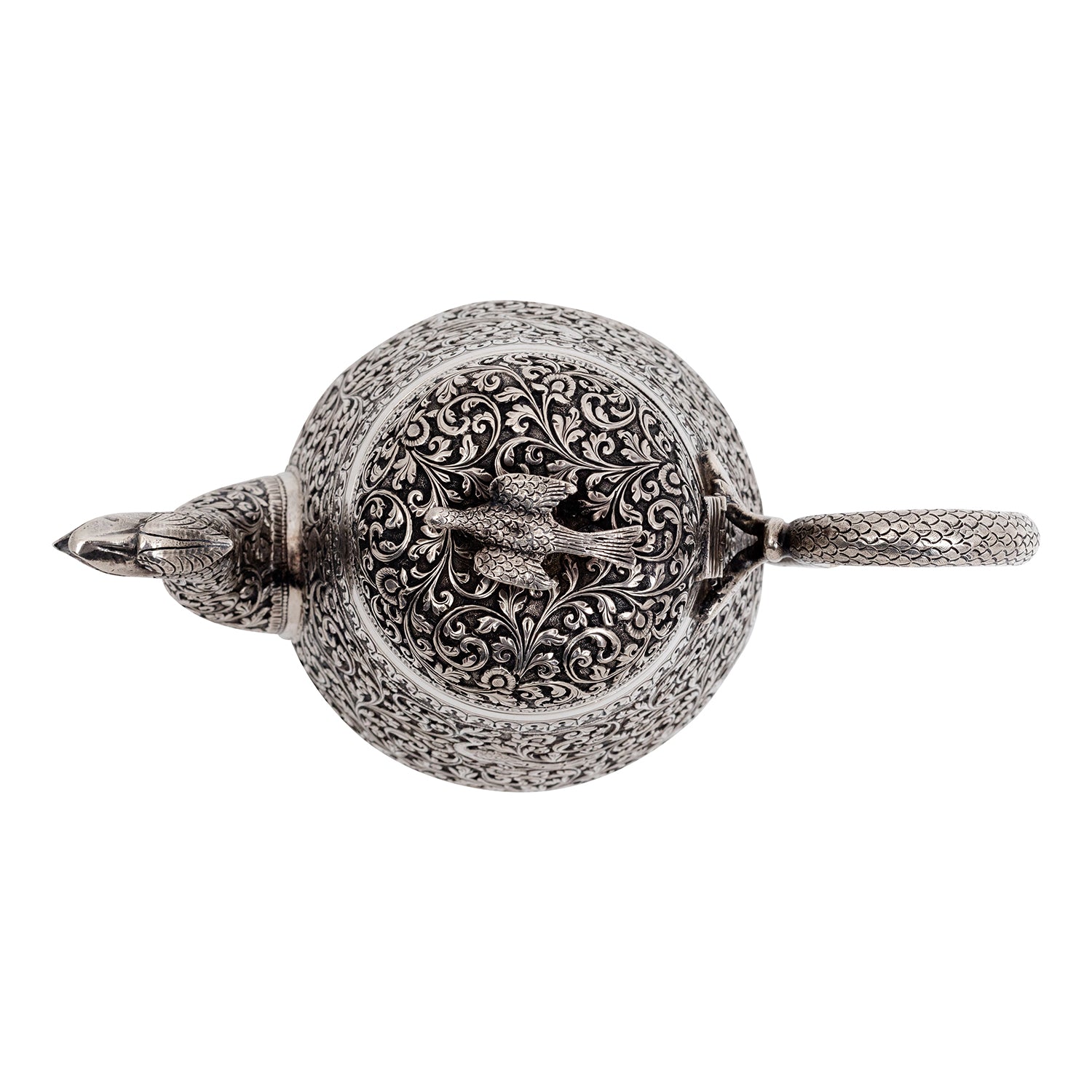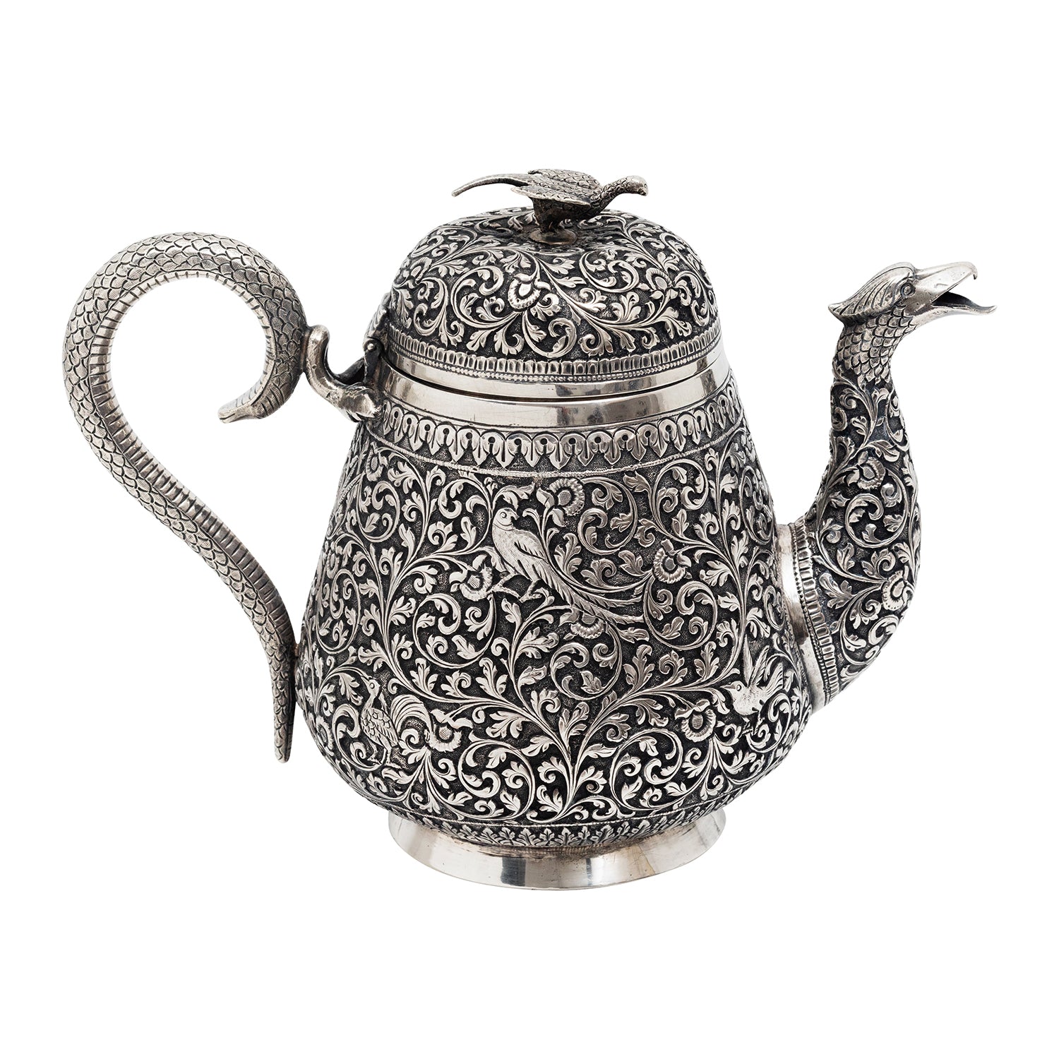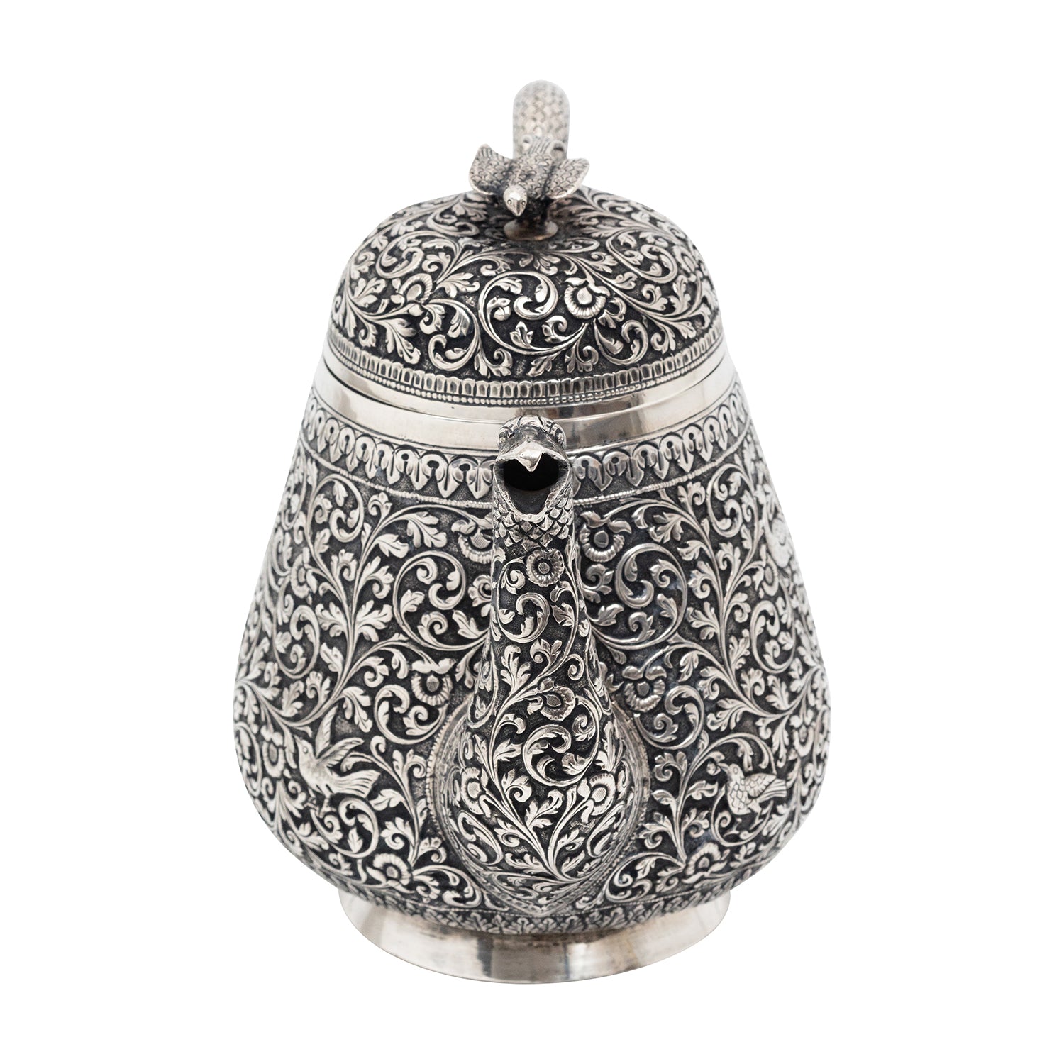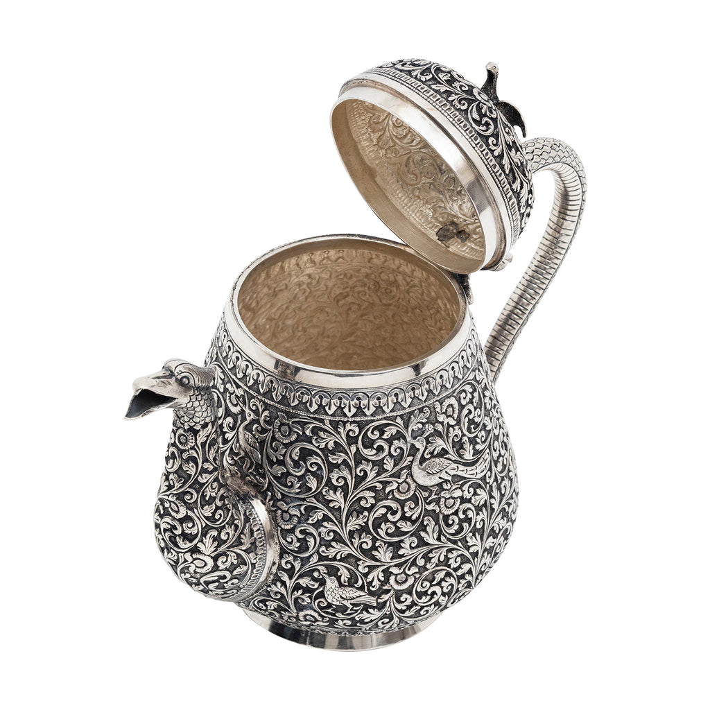 Experience the allure of a bygone era with this exquisite antique Indian (Kutch, Gujarat) silver tea pot, designed and crafted in Circa 1850-1880). Impeccably adorned with intricate repoussé designs featuring delicate scrolling foliage, enchanting flowers, and captivating depictions of majestic peacocks, this tea pot is a true work of art.
