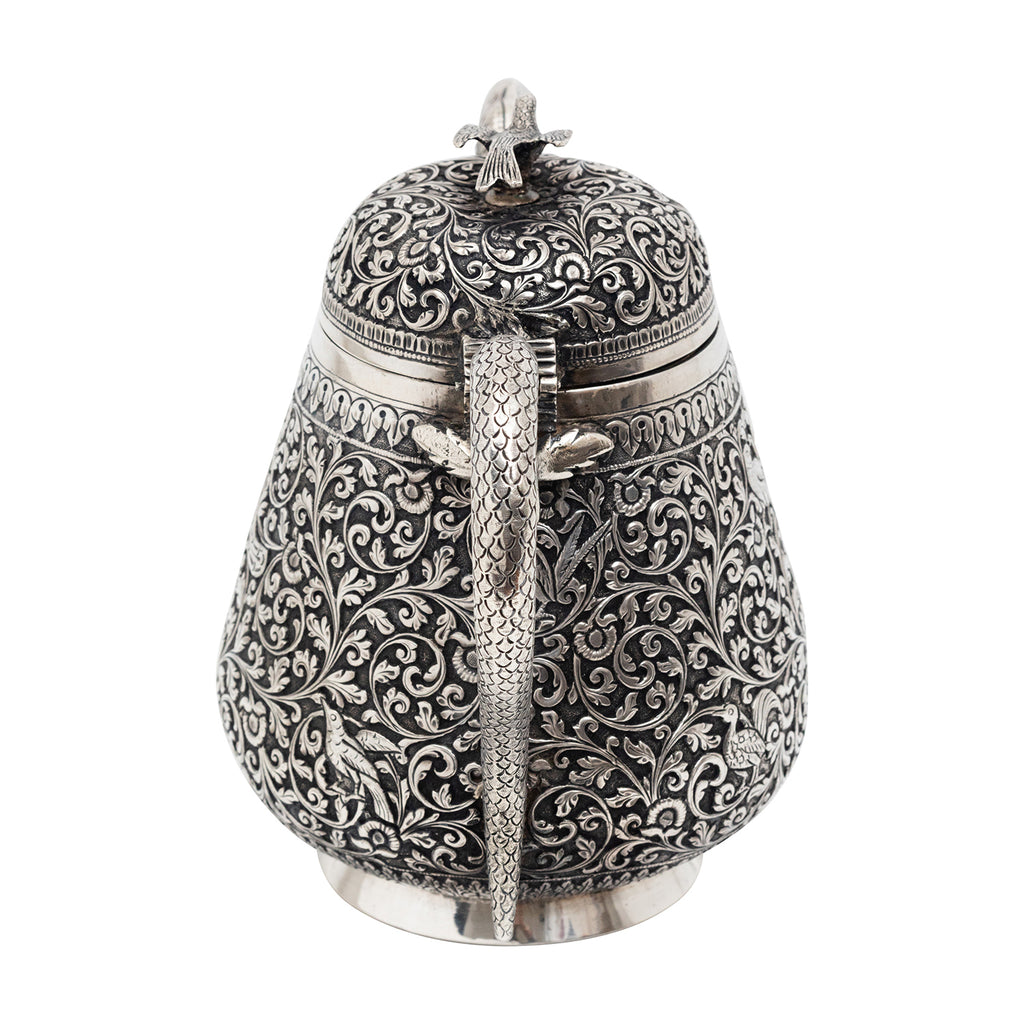 The silver handle is masterfully crafted to resemble a graceful snake, while the stout boasts a stunning bird's head design, adding a touch of whimsy to its elegance. The lid is adorned with a beautifully crafted silver flying bird, further enhancing its charm and uniqueness.