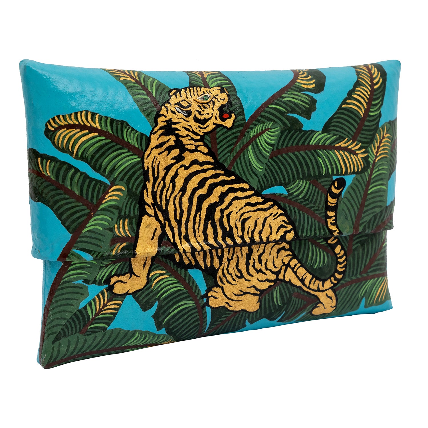 An elegant tropical clutch made from Indonesian Bamboo, hand-woven in wicker style by artisans with traditional skills. The bag is covered in cloth, hand-painted