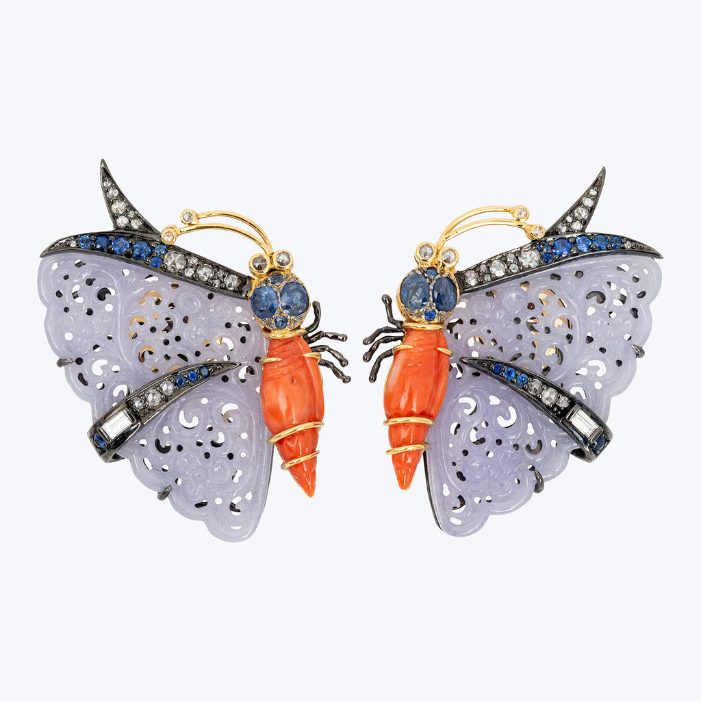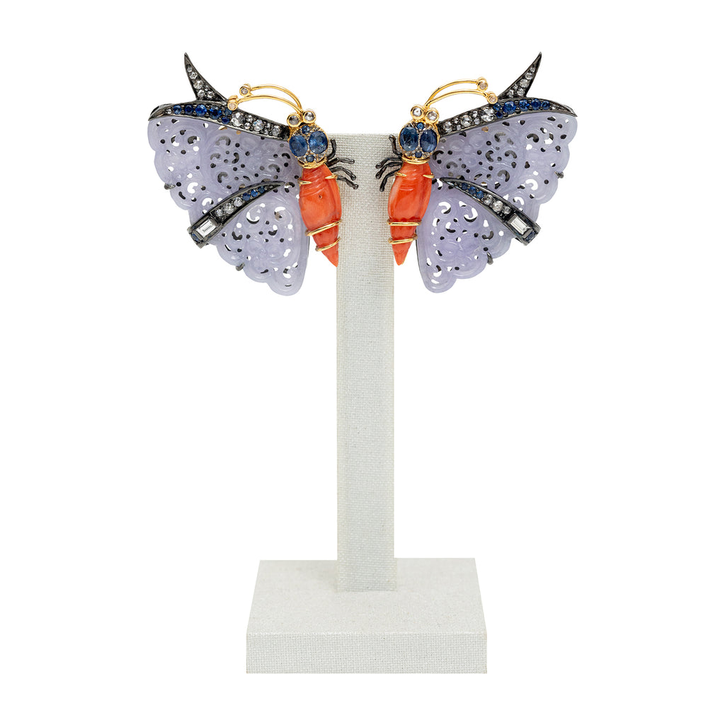 Introducing these exquisite butterfly earrings, with a pair of delicate wings, intricately carved from the enchanting lavender jade. The soft, soothing hues of Lavender make these earrings a harmonious blend of nature's artistry and human craftsmanship. The body of each butterfly is a dazzling display of opulence, composed of a rich tapestry of gemstones. Red Stone, reminiscent of passion and vitality, forms the core, while Blue Sapphires and Diamonds are generously scattered across the body, offering a breathtaking play of light and sparkle with every movement.