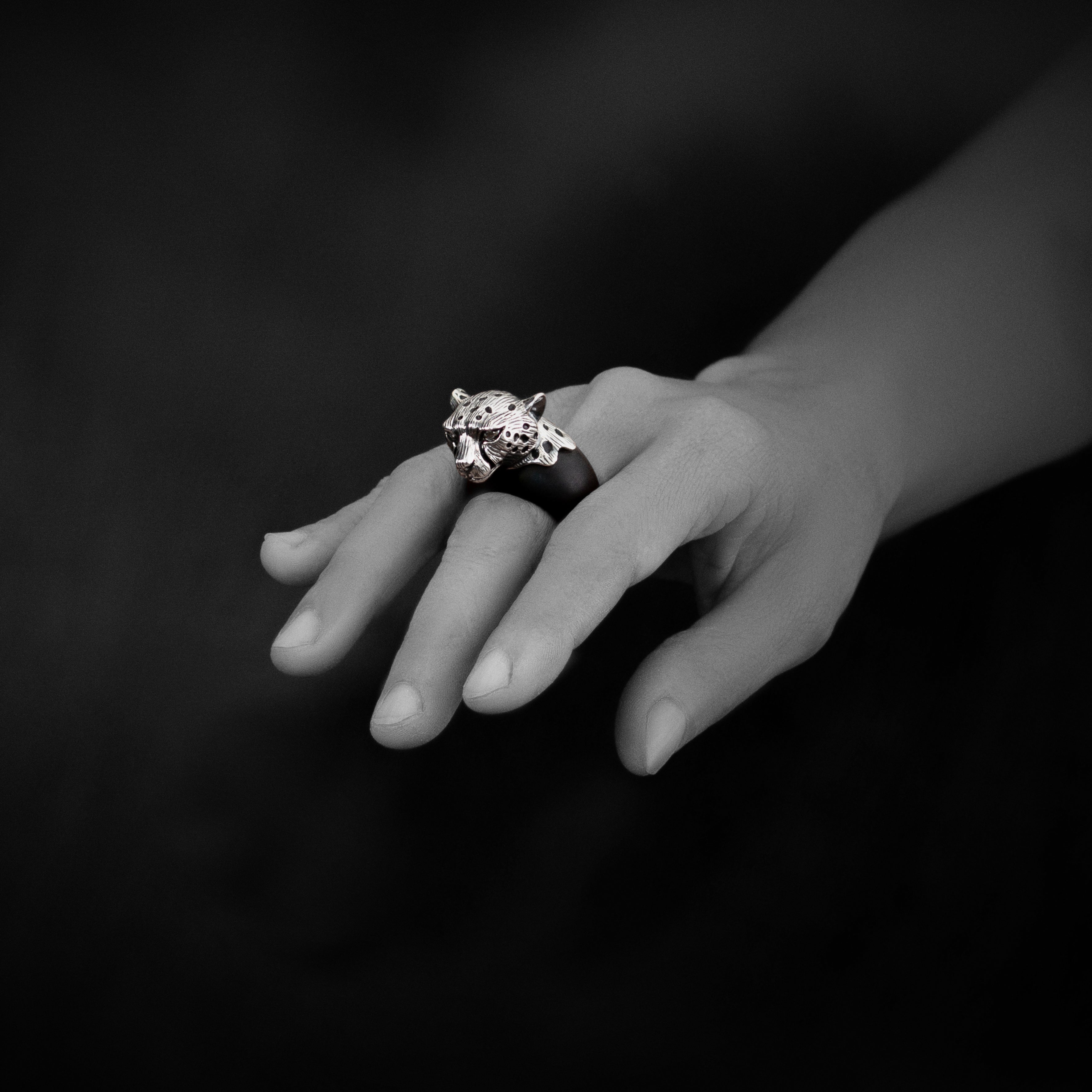 Hand-carved black wood ring, with a Sterling Silver Cheetah designed onto it. Its eyes have been set with white rose cut diamond.