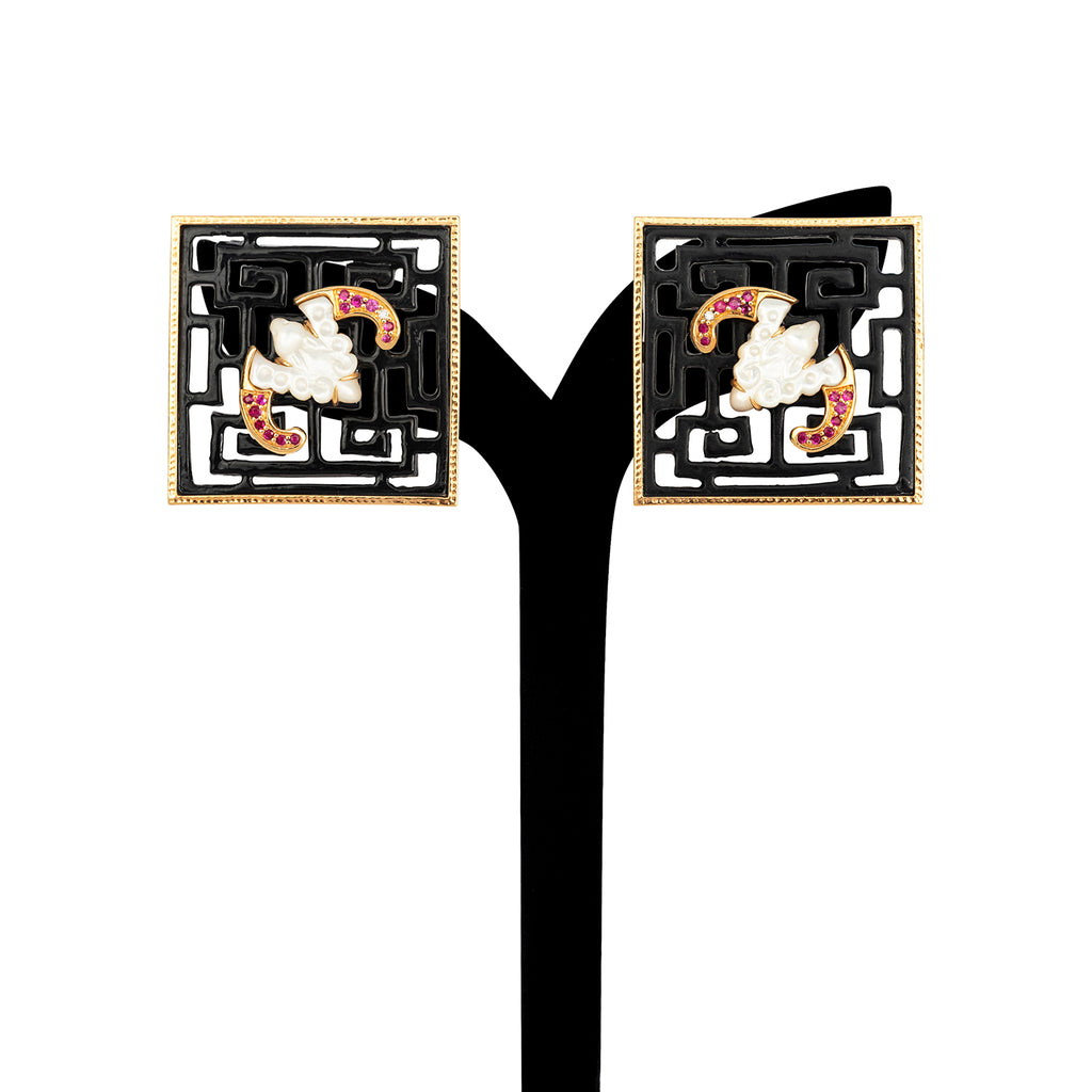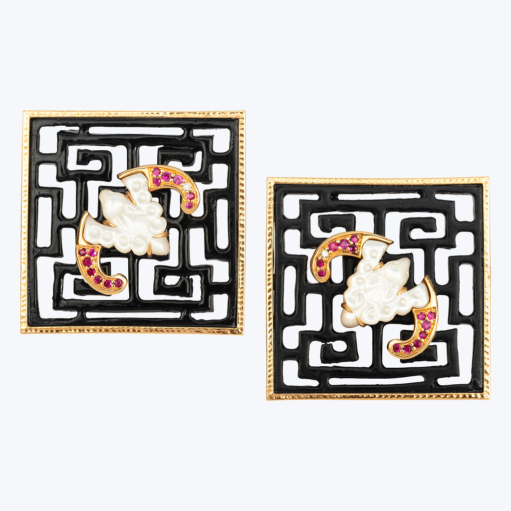 Circular Knot earrings decorated with a beautifgul mother of pearl Bat, diamonds and rubies all set in 18K gold.