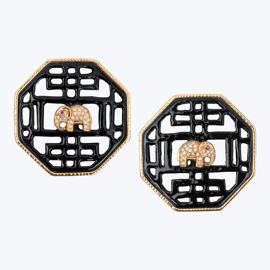 An elegant pair of Chinese knot earrings, lacquered in black, surrounded with 18K gold. The centerpiece features diamond-studded elephants set in 18K gold, each adorned with a sparkling ruby for its eye.