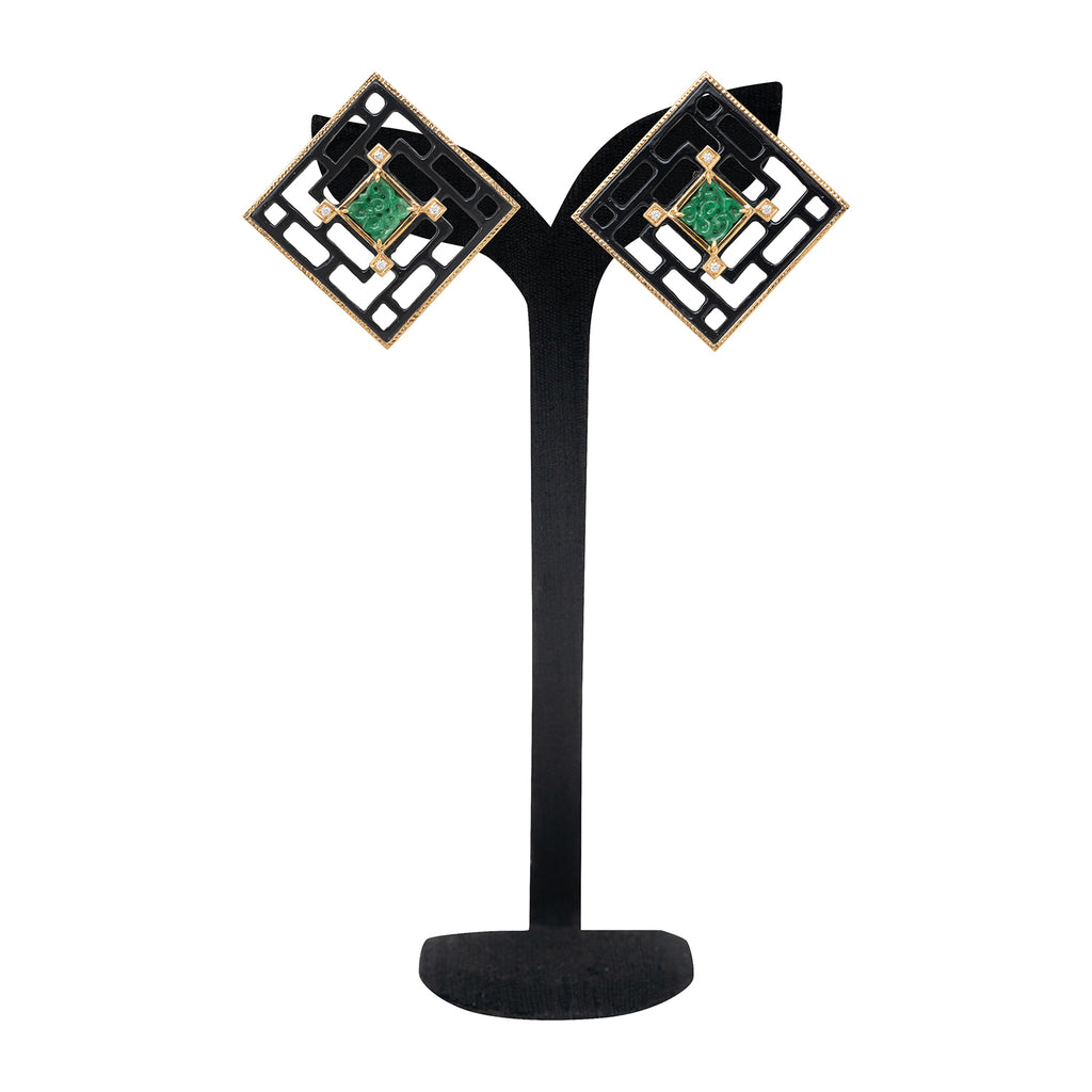 An elegant pair of knot earrings, lacquered in black, surrounded with 18K gold. At the center, carved jades grace the design with 18K gold and diamonds.