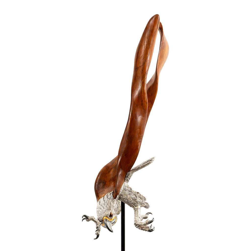 Sculpted from Single piece of Teak root wood, the piece was designed with Sterling silver head, feet, beak and claws. Eyes are made out of Tiger’s eyes quartz, set on a black granite stand. Fascinated with the beauty of an eagle ready to pounce a flight, the idea of the wooden sculpture came to life.