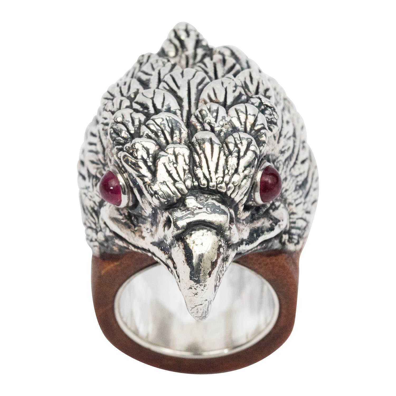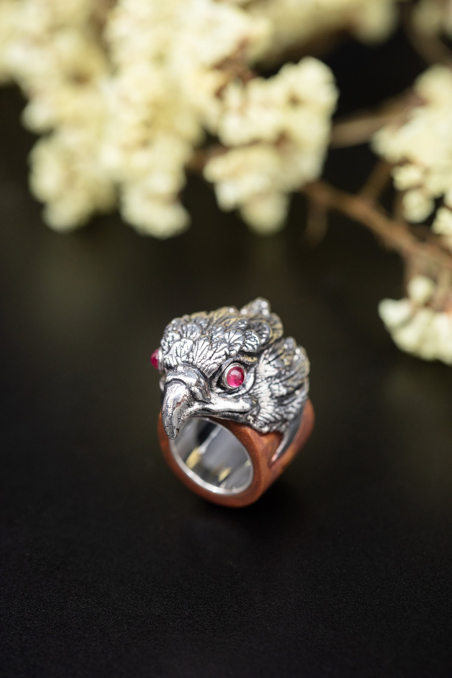 A sophisticated bamboo ring, meticulously crafted from natural Japanese bamboo root, features a striking silver falcon, elegantly embellished red rubellite gemstones set in its eyes. The interior of the ring is luxuriously lined with sterling silver, providing both comfort and an exquisite finish. This captivating design beautifully marries the essence of nature with fine artistry, making it a remarkable statement piece that exudes sophistication.
