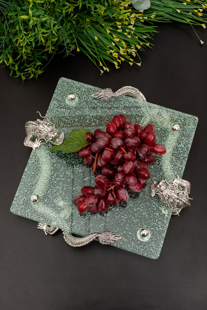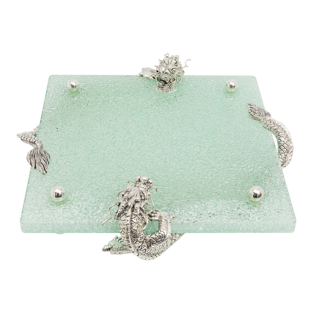 | Hand-made and hand-carved green glass plate with twin Sterling Silver swirling Dragons Luminous, rippling green glass gives a cool underwater feeling to this contemporary plate. Cold cuts, sushi, salad or fruit appear artistically appetizing when arranged on this plate. Each piece takes approximately 6 weeks to create. Size: 35(W) x 37(L) x 8.5(H) cm. Weight: 3.9 Kg. |