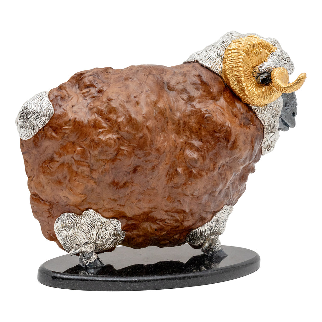 Sculpture made from a single piece of rare Japanese Burl wood and embellished with a sterling silver Ram, the eyes of the Ram are set with Citrine, emphasizing its striking details and the golden horns which made out of silver decorated with 24K Gold-leaf, the face and feet are black Rhodium silver. The piece is set on black granite stand.