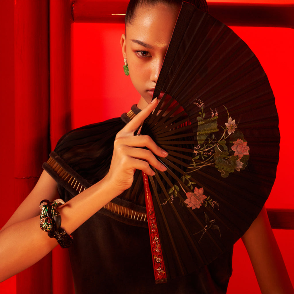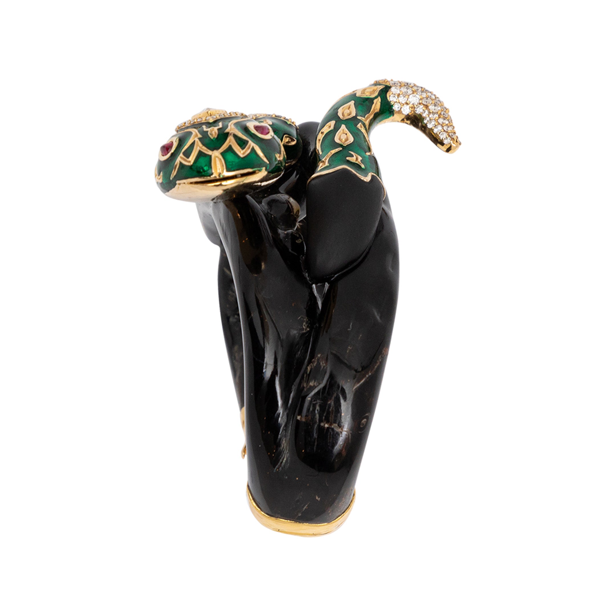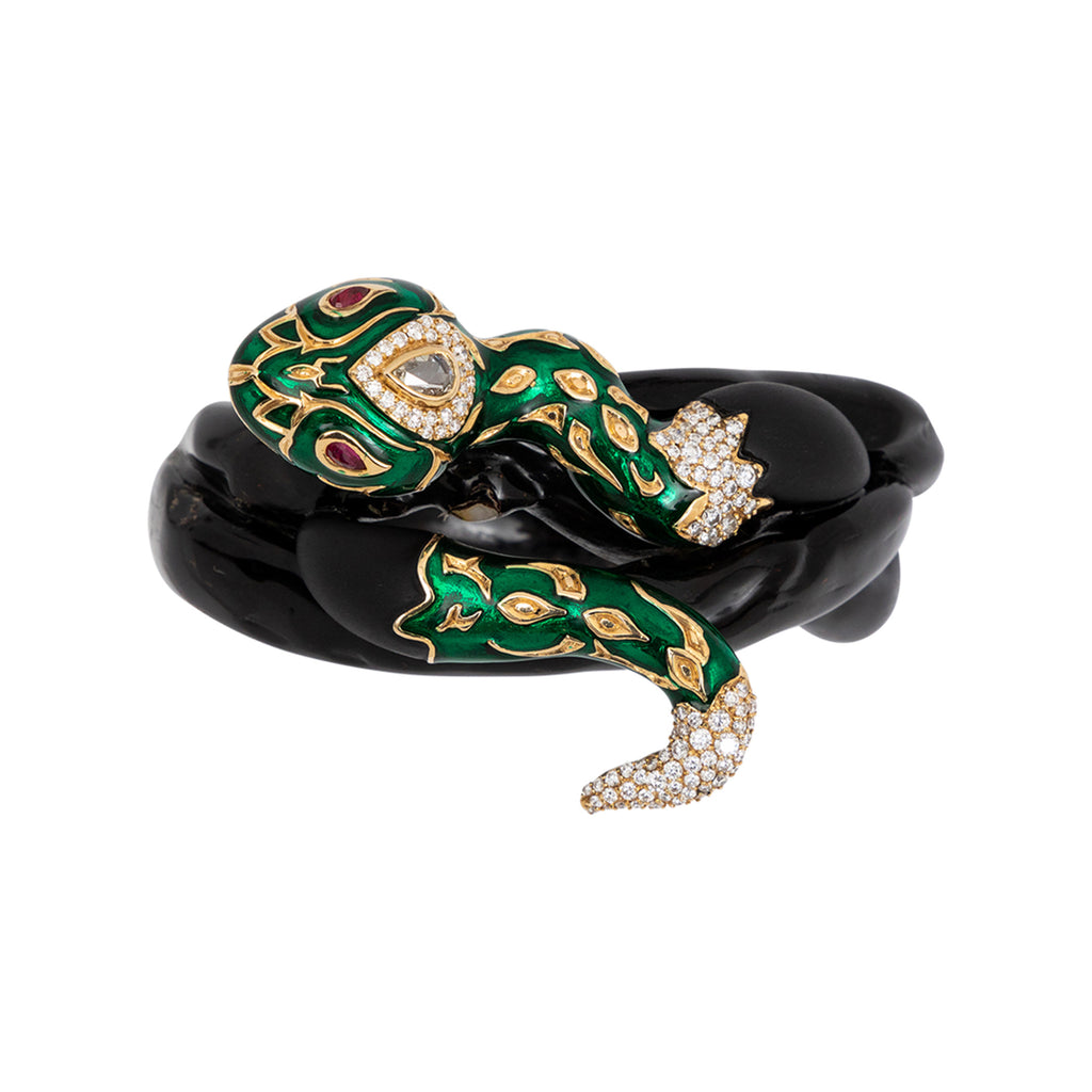 A stunning Snake bangle hand crafted from polished black wood, decorated ‘hot green enamel’ work. The snake has been studded with a wide array of Diamonds on its head, tail and towards the neck, all set in 14K Gold, and has been brought to life with Rubies set in its eyes. The lock is in 18K Gold. Together with the organic form of the black wood, it is believed in many cultures to wear it as the protector and chase away bad luck.