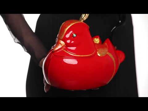A gorgeously lacquered Duck bag, designed beautifully in contrasting shades of red lacquer and 24K Gold leaf on red lacquer as an antique look. A fiber glass handle lacquered in black is held onto the bag with gold plated sterling silver, with a prayer bead gold leaf lock. The eyes have been studded with turquoise in gold plated sterling silver. The bag has been lined in textile.